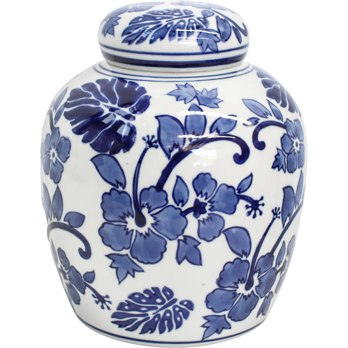 It is in the right kind of high temperature firing that porcelain gets its fabulous sheen and this is evident on this Ginger jar with its pattern in blue. It stands as high as 20 CM curved delicately and broader towards the top it has a tiny little lid that sits perfectly on its around mouth. Store spices, exotic tea, or anything that you wish to reach for easily - better still, fresh blooms could be placed in it for a great display. The fresh blue and white colour, stands out with its vibrancy. Added to your console where you could place other porcelain articles from your collection to make a dramatic statement. Even as a stand-alone, it manages to grab attention with its classic good looks. You could make a pair of such jars holding your everyday need condiments in the kitchen. Will instantly brighten the space where it is placed.