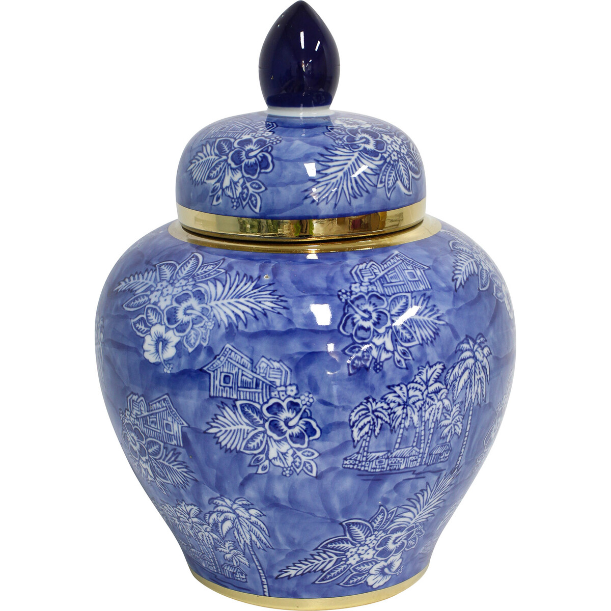 Apart from its satisfying all of the features of ancient Chinese ginger jars, this #Ginger Jar South Pacific goes the extra mile in adding a touch of resplendent gold hue to the traditional blue glazed pattern. The golden ornamentation can be seen accenting the rim of the ginger jar and its domed lid. The lid itself has its domed part glazed in a darker shade of glossy blue colour. The base of this porcelain jar is equally decorated with a thin line of gold colour.