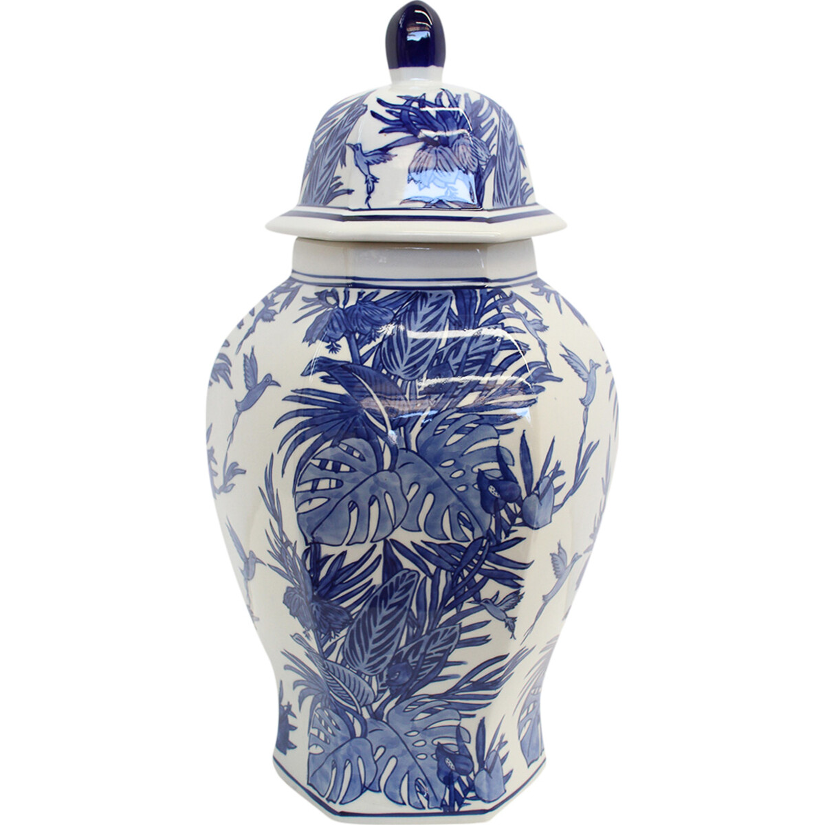 If you're after a classic look with a modern twist, our hand-painted Ginger Jar really stands out on any display. The blue and white porcelain pattern - that's always been a best-seller for us, by the way - is finished here in a tropical motif that's become very popular at the moment. And this piece is really versatile. It's ideal as a bold centrepiece on an entry table or dining room sideboard, but we've also seen designers use them to fill out layered shelving or as part of larger statement arrangements with other ceramics.
