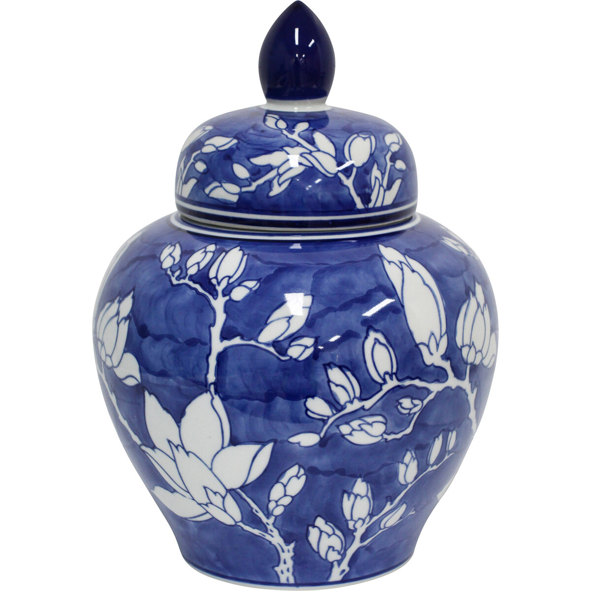 Standing a 27 centimetres in height, 19 centimetres in length, and an equal 19 centimetres in width, this #Ginger Magnolia gives your customers the opportunity of enjoying the ornamental appeal of traditional ancient Chinese ginger jar while also getting to maximise floor, table and general horizontal space. This is because it is made with a small base, but nonetheless possessive of great visual appeal. On the predominantly blue glossy exterior is the hand painted motif of flowers.