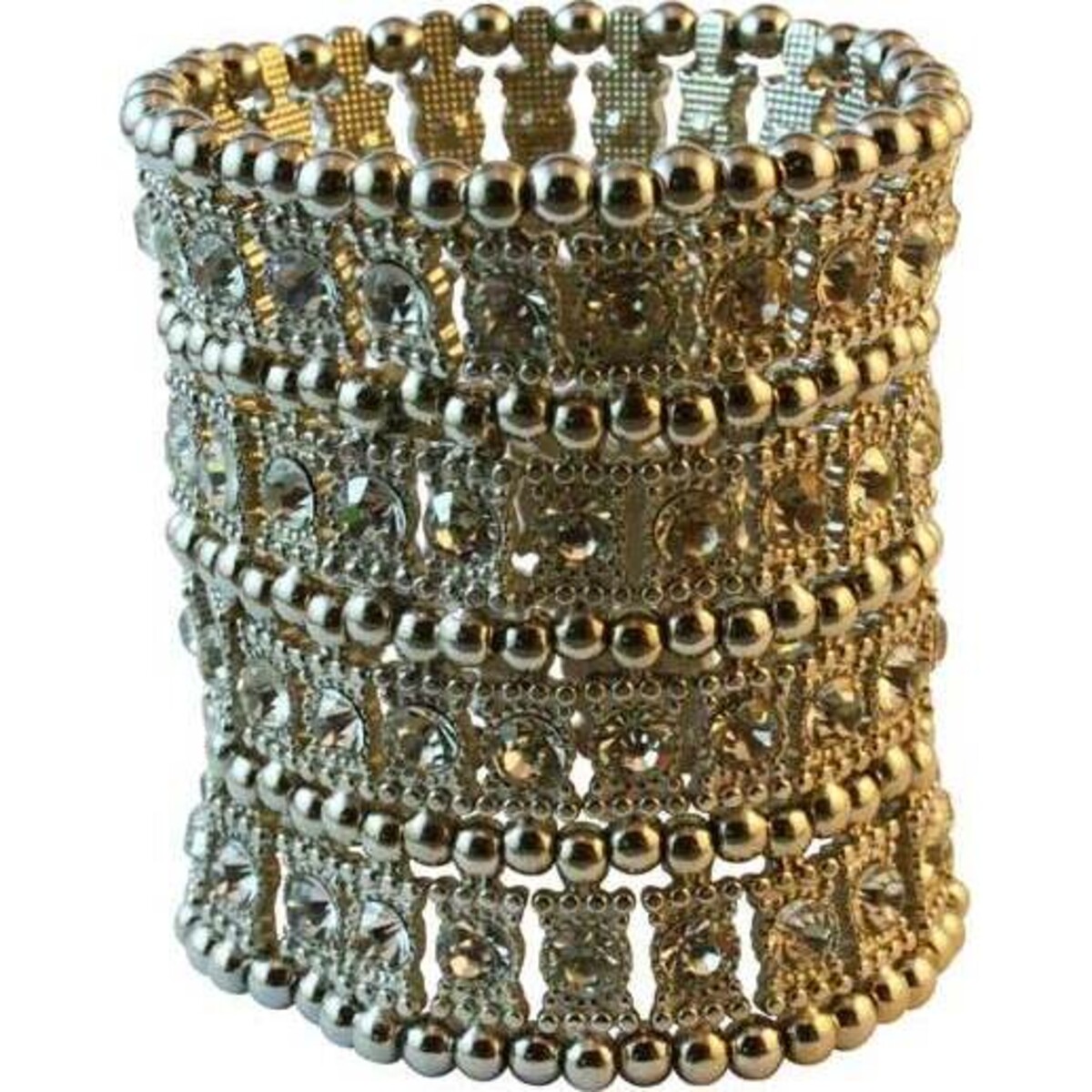 This gorgeous cuff bracelet consists of metallic beads and clear crystal embellishments that come together to form a piece of jewelry you'll never want to stop wearing. It's sure to be your new favourite piece in your jewelry box. There's just something about it that just grabs and holds your attention. While it would look lovely with a casual jeans and t-shirt ensemble, it can look just as glamorous with a formal evening gown. With this piece, the style possibilities of what you could pair it with are endless.