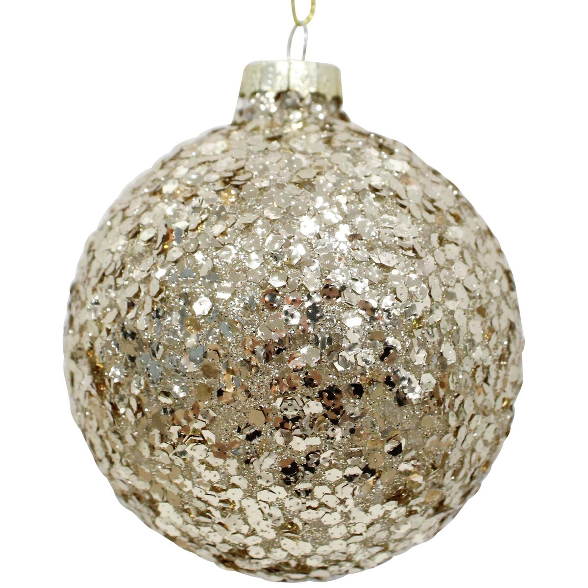 Hanging this exquisite bauble on one's tree makes it the focal point of any holiday decoration. Its timeless charm and sparkling allure will elevate the overall ambience, creating a festive atmosphere that's both warm and inviting. With its unique glass construction and eye-catching glitter, this sparkly decoration will bring a touch of elegance to any room in any home. Whether it is hung from the ceiling or displayed on a mantle, our Glass Bauble Palm Glitter is sure to shine throughout the holidays. Homeowners can elevate their holiday decor with the Glass Bauble Champagne Glitter. Let its brilliance become a cherished part of their seasonal celebrations, making the home a place of beauty and joy during this special time of year.