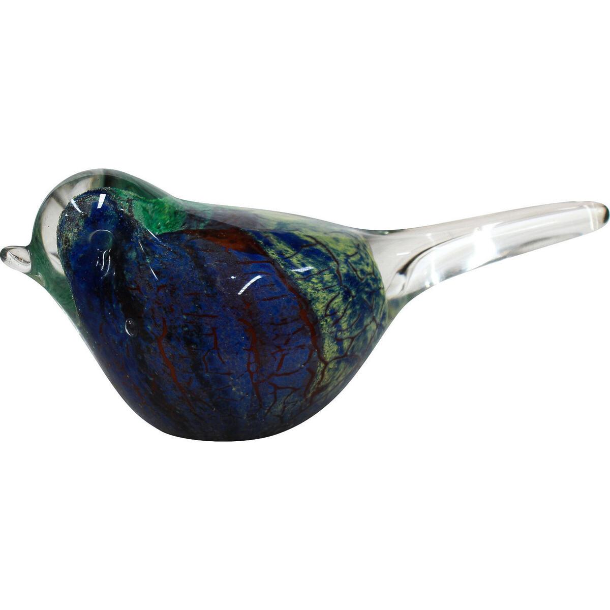 This beautifully designed songbird has a cute little upturned beak and it appears to be ready to sing! The solid clear cased glass encloses a black veined green, blue, red and yellow spangled glass interior. The ground and polished bottom is curved on the sided and is given a smooth flat finish. The beak and the straight outwards protruding tail are in natural transparent glass colour. This elegant piece is an ideal pick for decorating purpose during the holidays, to create a woodland scene or display on the entryway table, as a corporate or personal gift and can also be given as a souvenir.