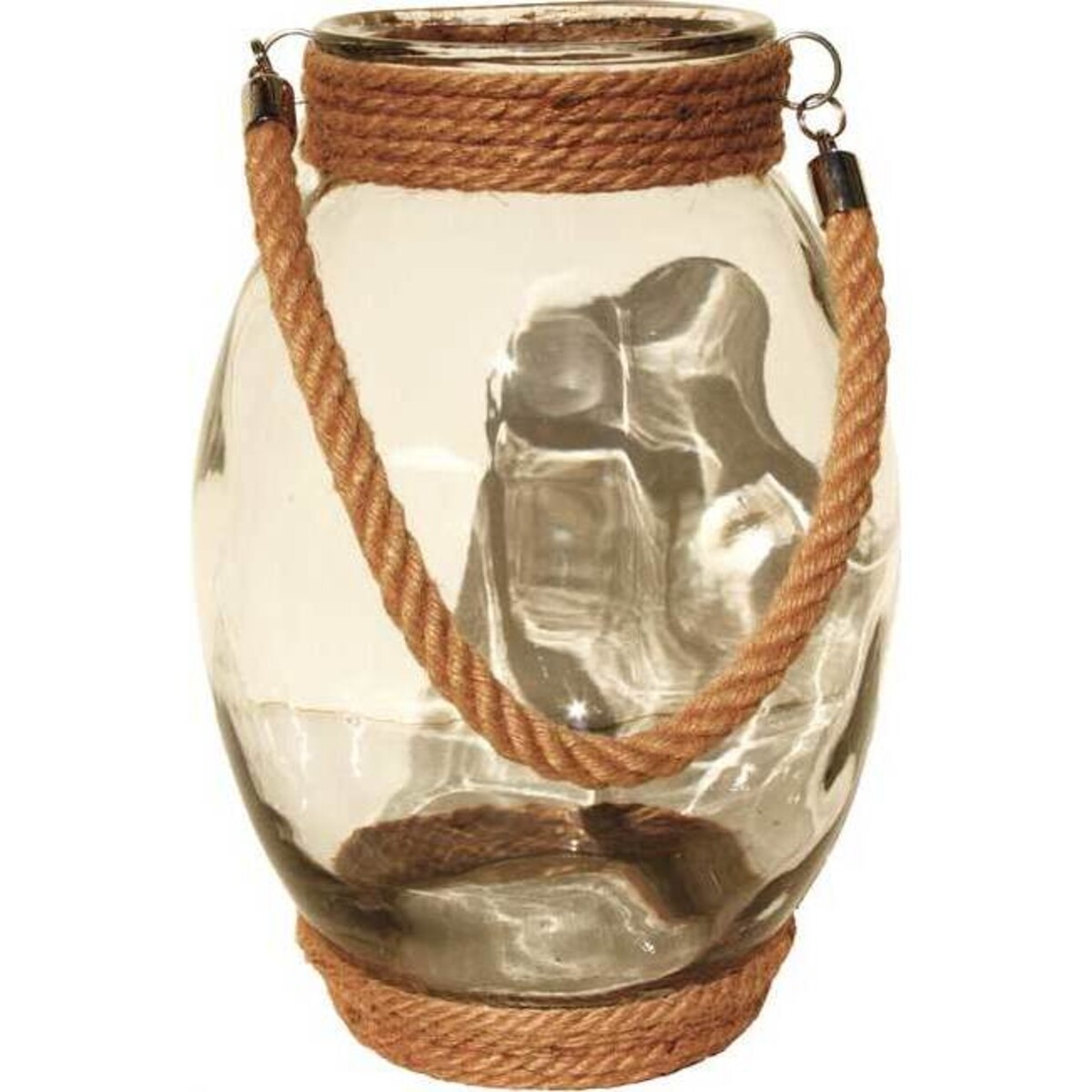 A round, balloon shape gives the Glass Bottle Balloon Jute from LaVida its name. This sparkling clear, glass bottle is slightly tapered at the top and bottom for an inflated or balloon - like appearance. The multiple coils of jute rope encircling both ends of the bottle add a bit of rustic texture to this otherwise very smooth accent piece. A length of thick, jute rope is attached at the top with small metal rings, making this piece easy to move or hang anywhere. This bottle would make the perfect container for a flameless candle or for holding a bouquet of fresh - cut flowers.