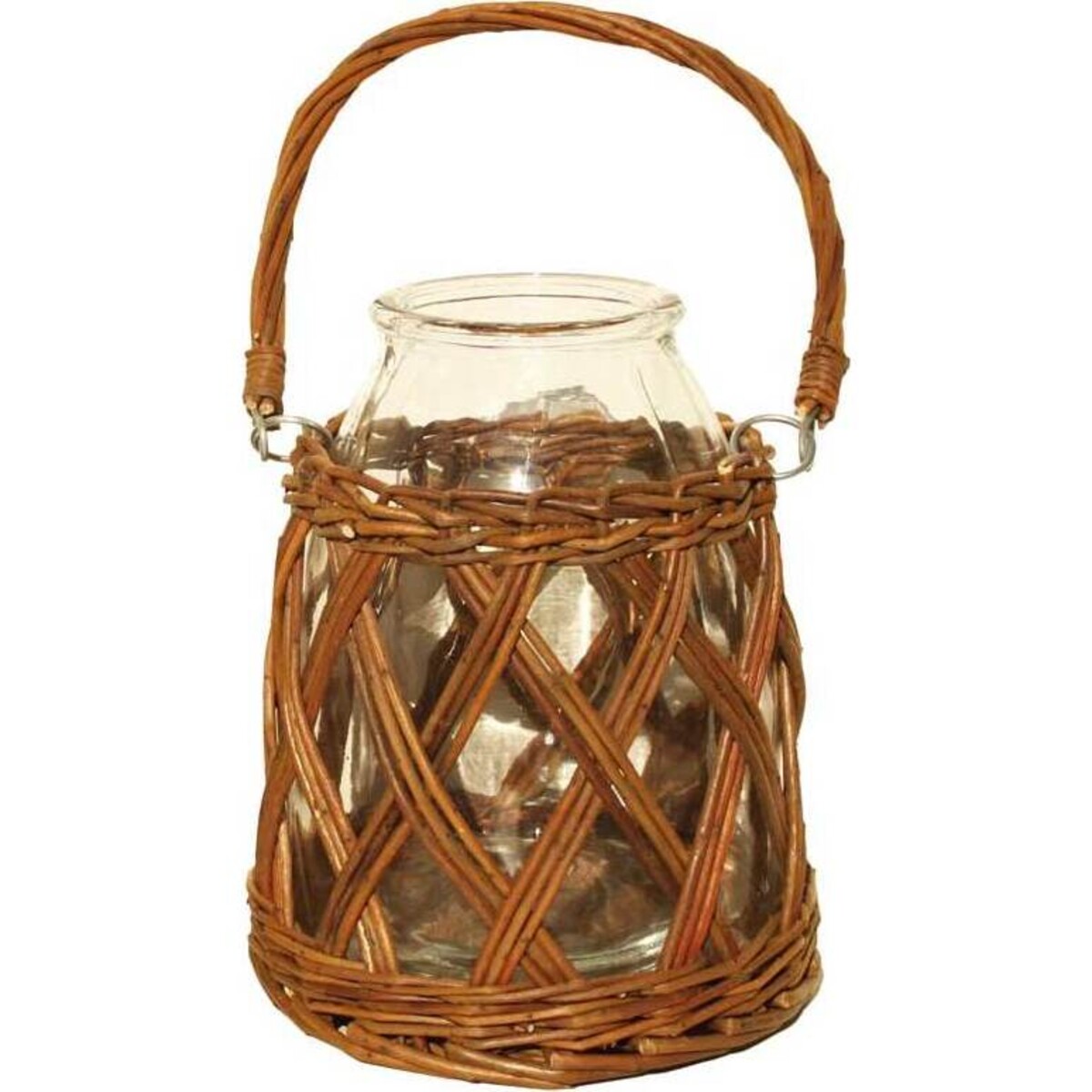 The diamond pattern created by the natural willow in LaVida's Glass Bottle Cestra Lgr creates visual interest while revealing the crystal - clear glass of the bottle underneath. This glass accent, the larger of two in a collection, features a natural willow basket around a tapered glass bottle. Attached to the top of the basket is a woven willow handle, making for easy transport or even hanging. A row of woven willow accents the top and bottom. Whether used alone or in groups, this bottle would make the perfect vessel for some flameless candles or as a decorative way to showcase a seashell collection.