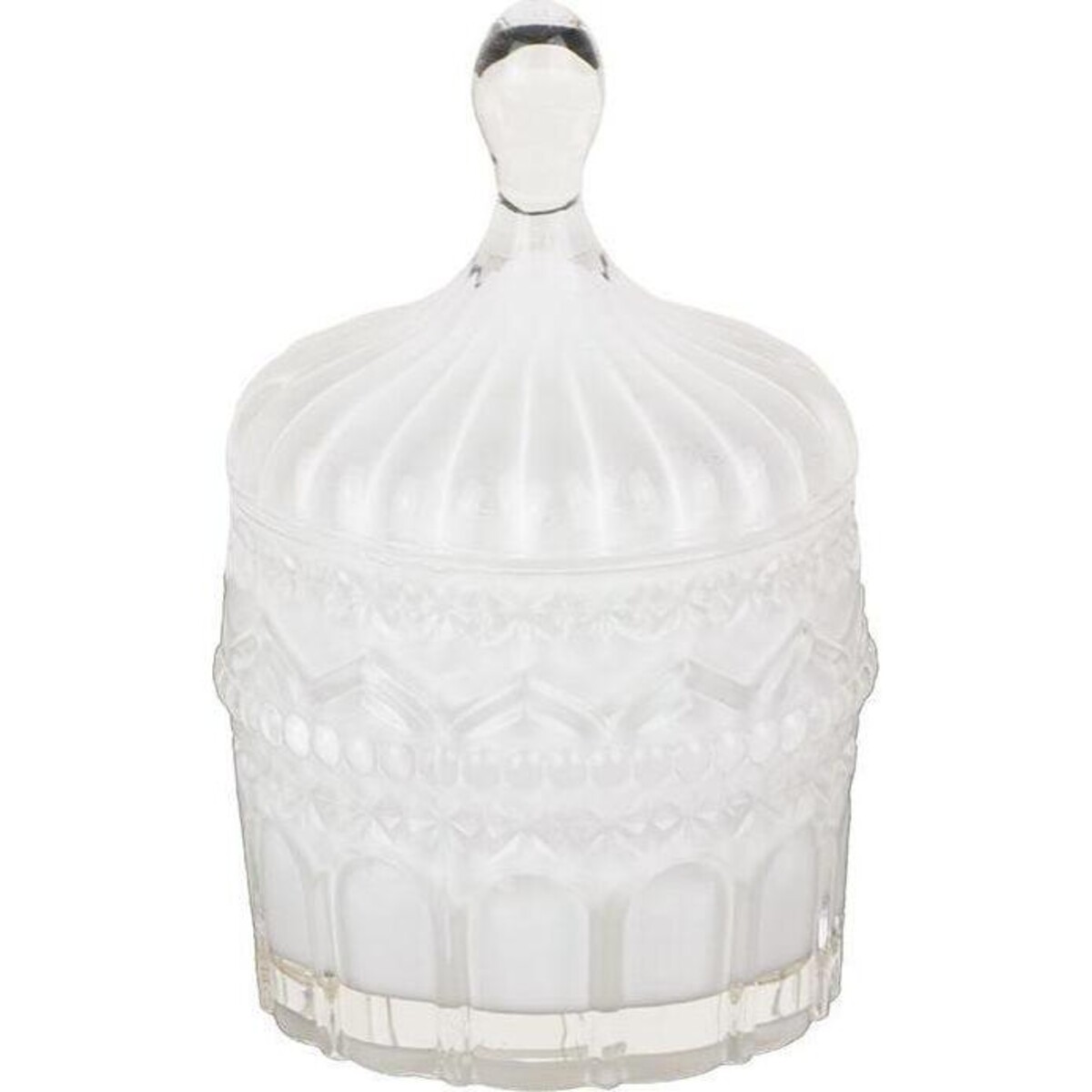 Give your vanity area a little facelift with the inclusion of this jar made of an intricately designed pattern that is ornate and stylish at the same time. Place all your much loved trinkets in it and feel the assurance of knowing that you will be able to reach out for just the right accessory to go with your dress this time around as you will simply have to lift the lid for it. Place this on your bedside or your dresser and see how pretty it makes that space look. It has a solid glass body with a curved ribbed top that can be easily lifted with a little knob. The lower portion of the jar has an arched pattern around it through which hat the jar holds is clearly visible. Place some dry scented flowers in it, spices or your spare button collection, there are so many things precious and tiny that need a safe haven and this could just be it.