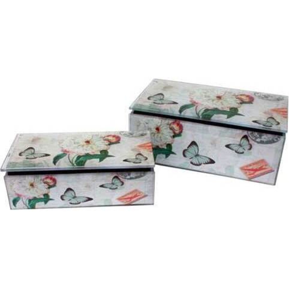 Introducing the set of 2 Faded Roses Glass Boxes. They look more like small works of art than a place to store your jewelry, trinkets or notes. Each pale gray box is designed with a stunning flower and butterfly print that is simply breathtaking. You're going to look for any excuse to use and display these lovely decorative and functional accents. And who said storage couldn't also be fabulously stylish?