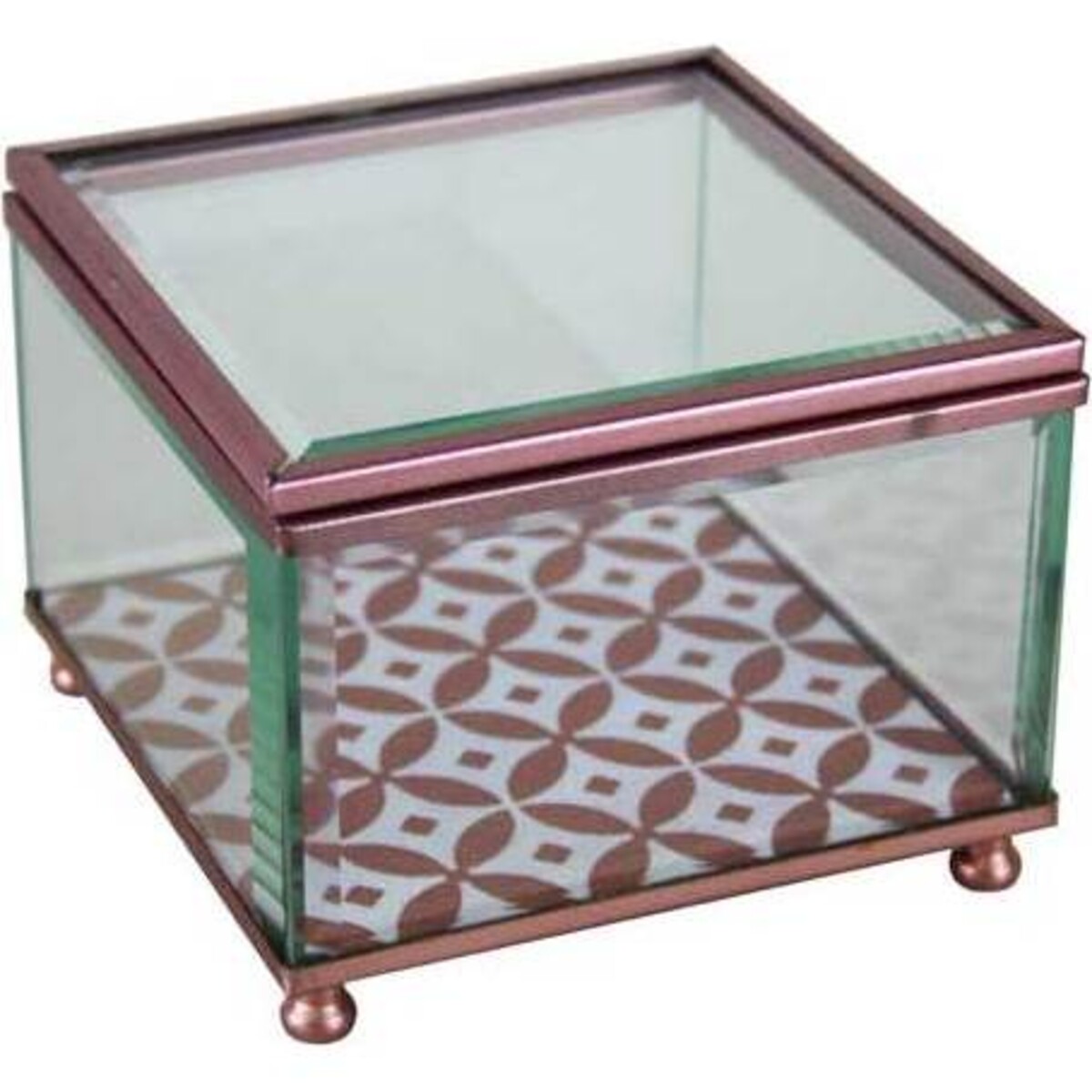Trinket boxes help one is keeping things organized and well within one's reach. But the matter of concern often is that one has to go rummaging through to locate one's things to know whether the thing we are looking for is actually in it. With a glass casing, this particular box acquires quite a unique feature that allows one to peer inside to actually locate things one needs. About 10 cm in length and breadth and 8 cm in height makes this a compact box that is easy to handle and place in any small space, be it the dresser or the bedside. Its clean good looks, the embellishment of patterns on the base and the gorgeous chrome detailing of the tiny round legs looks so very charming and an interesting element of its design. The glass is of superior quality and quite clear while the metallic beading on the base and the top is very neatly done. The pattern in rusty red is created from a piece of fabric and gives this box its unique look.