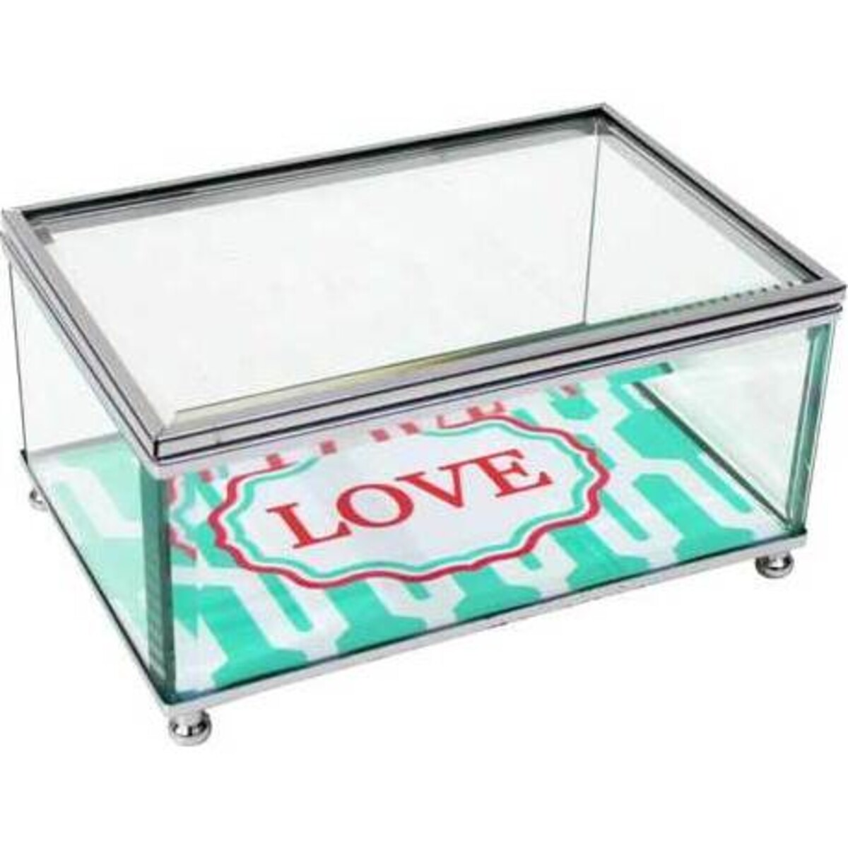 Mint green and hot pink; the ideal combination for anyone looking to add a pop of colour to an otherwise bland room. Placed on a black or white surface, the bright colours found on the bottom of the glass box will stand out dramatically and really become a focal point of any area surrounding it. Resting on four silver balls that have a mirror effect, the box also features a silver border that surrounds the lid of the glass box. The phrase éLOVEé written in large pink letters looks beautiful as is. There is almost no need to put anything in the box because it is beautiful all on its own!