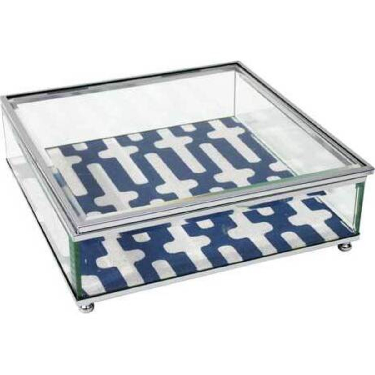 The thin, square shape of this glass box is ideal for placing documents or even small bracelets. The deep indigo colour on the base of the box features white, cross like shapes that interlace beautifully. The piece resembles an antique due to the design along the base as well. With four small balls located on the bottom of the box, allowing for easy resting and support of the structure, the glass base remains unharmed. The thick metallic border that surrounds all four sides of the box adds an elegant touch. Place this chic box on an antique nightstand or modern table and either way you will have an eye - catching showpiece bringing the whole room together.