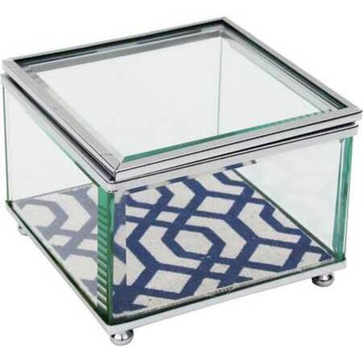 For a piece that is both chic and unique, this small glass box is ideal. The square shaped, metal - rimmed box features turquoise and indigo colours. The primary colour is indigo, which is found in the lattice pattern that covers the bottom of the glass box. The pattern is so beautiful that the box can be used a showpiece all on its own. The touch of turquoise accents located along the sides of the box are a great touch that look beautiful against the deep indigo. The best part is that the bottom of the box is safe from scratches due the four silver balls that the box rests upon.