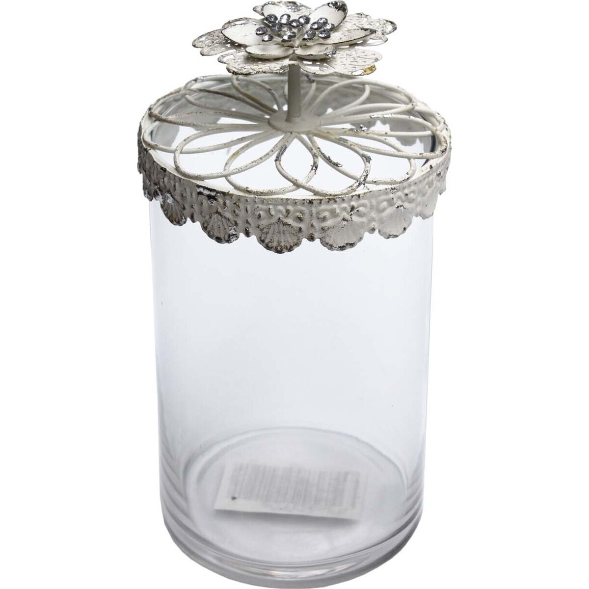 The cylinder shaped bottom is comprised of clear glass so it's easy to see and access what's stored inside. Surrounding the top of the canisters is an exquisite white fan-shaped detailing that adds glamor to the pieces. Large white open overlapping petals make up the lid and allow easy visibility through the top of the product. A two-layer white flower rises up from the petals and has a handful of sparkling embellishments on top for an extra sweet touch. These glass canisters are wonderful additions to any room regardless of the decorating style. They can hold everything from cotton balls on a bathroom counter to hard candies on a coffee table. They're also wonderful to use for special occasions or to give as gifts.