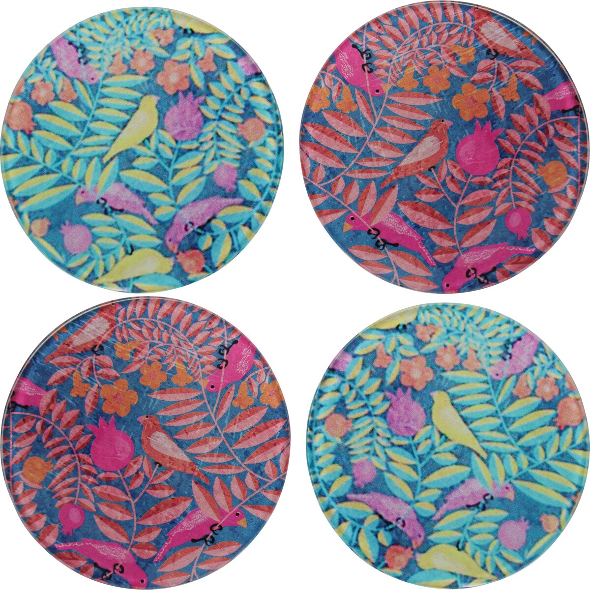 This set of four coasters with a bright theme and colourful print of singing birds exudes old-world charm and a happy feel. Inspired by nature, this set of coasters comes with 4 pieces, each about 10x10x0.3cms which will bring a touch of love and beauty into your home with its expertly crafted design. These coasters are made of tempered glass and do not stain easily. An appealing picture of nature and birds can be seen here with lovely style and colours that bring out its distinct and wonderful aspects. The coaster will bring back fond memories! In the centre of each coaster, there is a beautiful vintage print of birds, flowers and leaves carefully inlaid. The colourful combination gives these coasters a unique and timeless appeal.