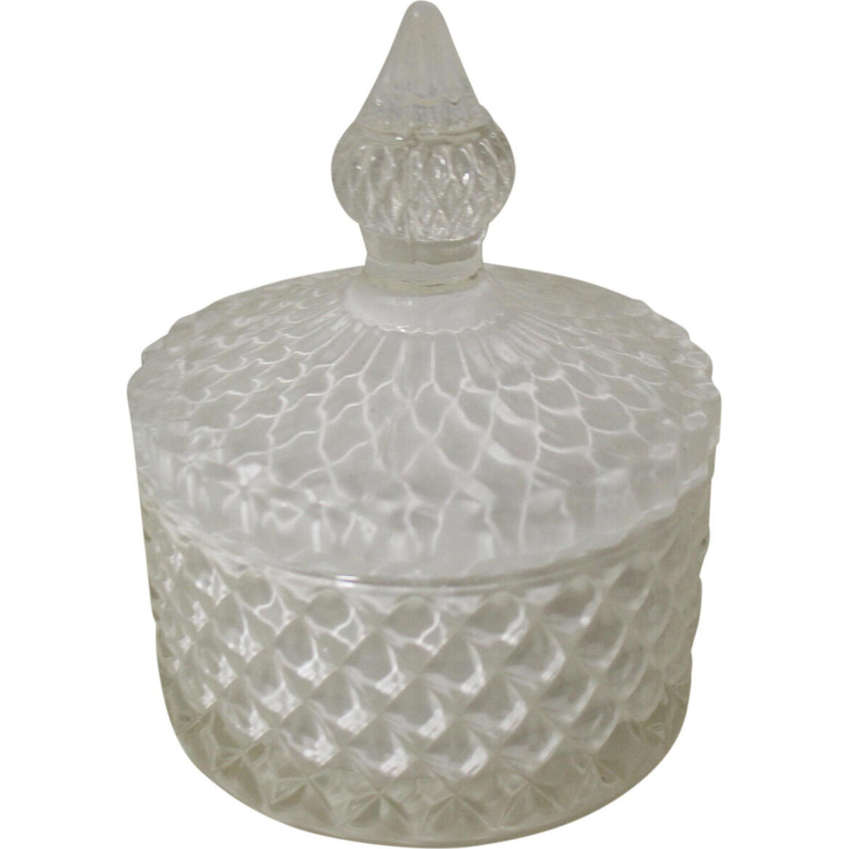The glass bodied trinket case comes with a gorgeous vintage heritage loo. Expertly created by artisans who know the technique of cut glass making, this piece shows the best in fine quality glass craftsmanship. The height of the piece is all of 12 cm while its diameter is all of 8.5 cm making it a perfect choice for adding the best of your earrings or studs, finger rings bd such tiny valuables which you have always feared losing. The lid sits niftily atop the ridge of the top - the top has a knob that gives you a grip that does not slip off your finger - an important element, in any kind of glass made item. The round case apart from being used as a trinket box could work wonderfully also to store your precious pieces or even work like any other accent on coffee tables or the side board.