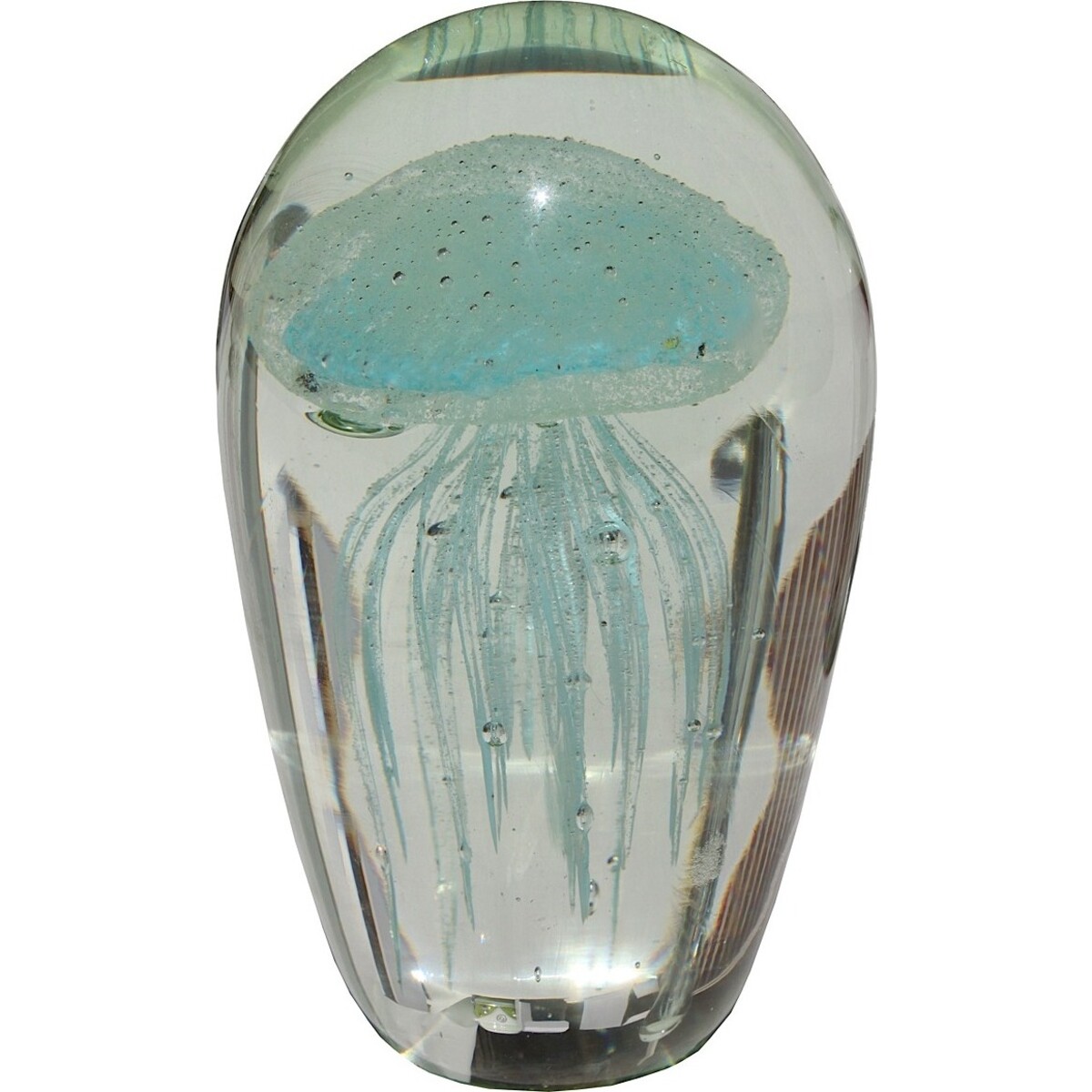 It is small. And that is why its presence on mantles, the coffee table or your desk would be noticed for its small yet effective presence. Created by an expert glass maker who understands the craft of creating a clear glass bauble which holds within itself the magic world of shapes made with tinted glass. A craft that is considered rather difficult to master, this has been excellently executed. Could be gifted to anyone who loves small collectibles or could be used on the table as a glass paper weight. The height is all of 11 cm with a broader top and narrower base on which it balances with ease. It holds an ethereal looking light blue jelly fish within. The very shape and the size that has been crafted speaks volumes of the expert craftsmanship and mastery over glass work. A wonderful small and impressive way to build in a beachside décor collection in your home.