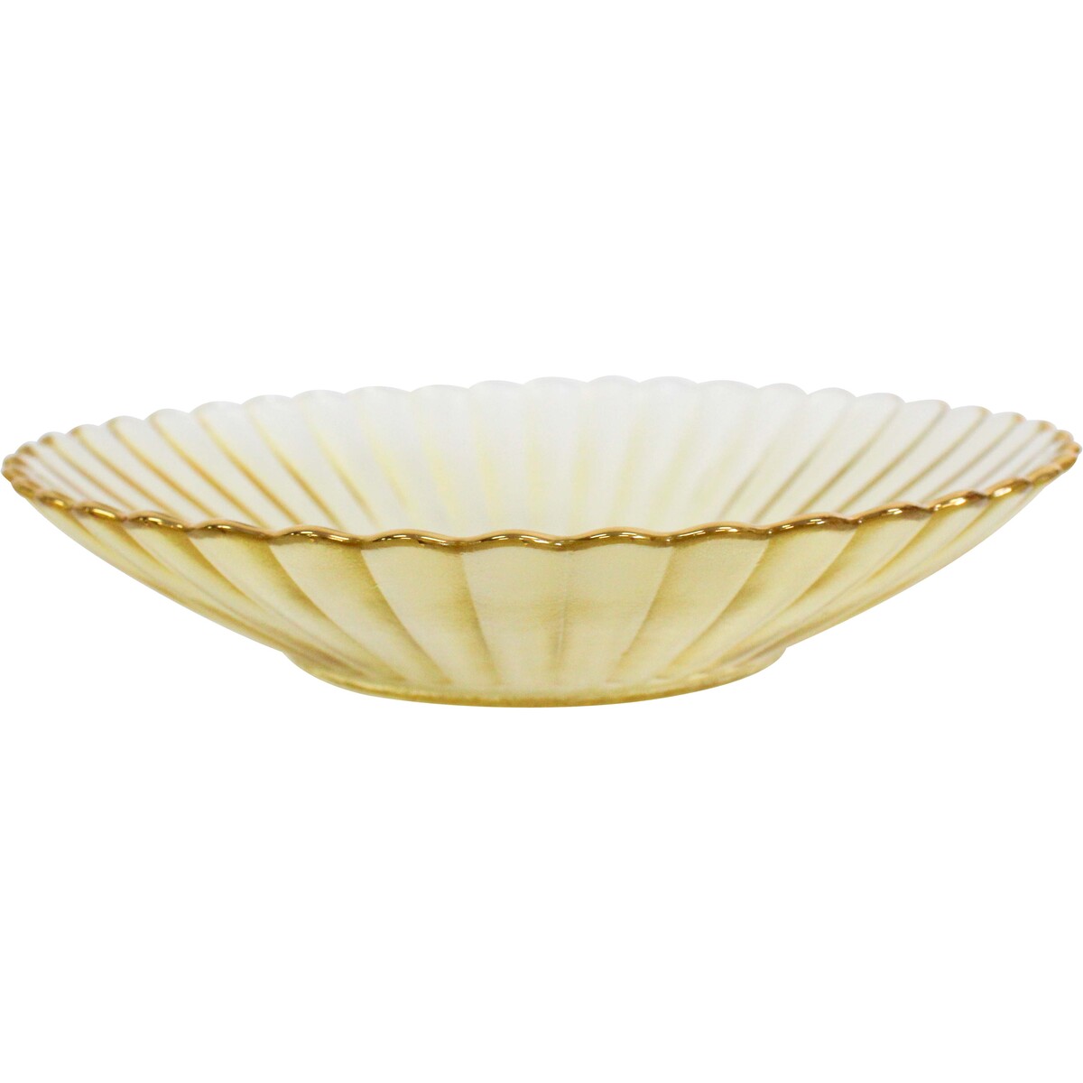 This Glass Dish Marrigold/Gold - 19.5x19.5x4cm is one of those pieces that feels a bit special in the hand, and honestly, looks even better on display. It’s glass, but the finish has this slightly frosted, almost antique marigold tone with just the right amount of gold detail around the rim - not too brassy, more understated luxury. That scalloped edge is what really gets people leaning in for a closer look, because it throws lovely shadows and lifts whatever’s inside.