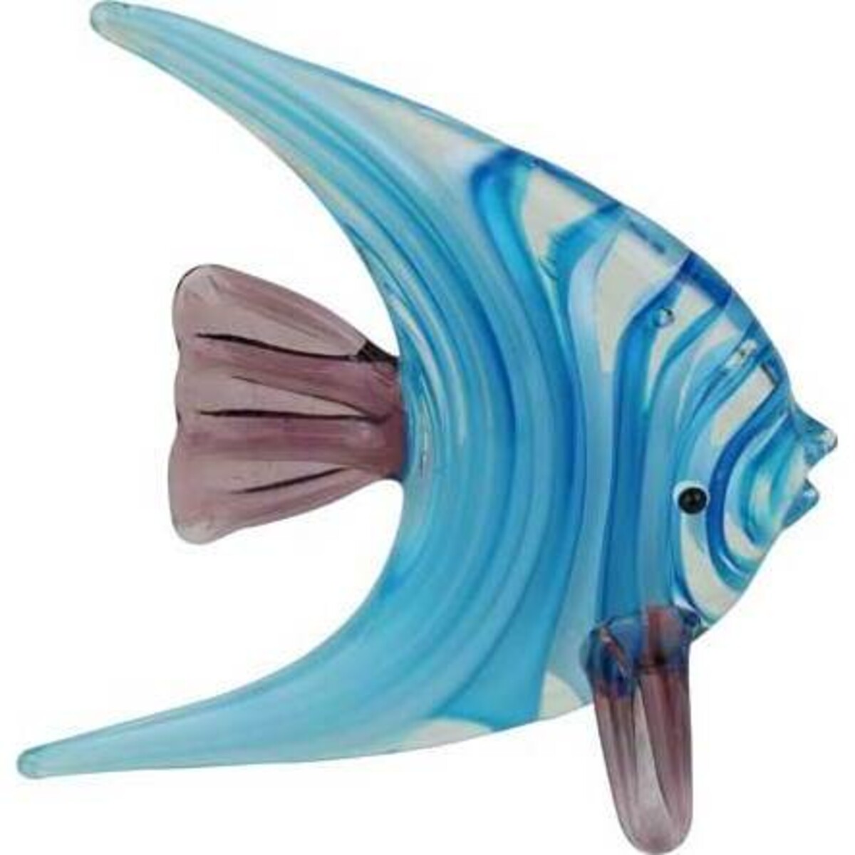 The item Glass Fish Purple Fin has the measurements 8x7x3 cm and exhibits a bow - like architecture. It features two main colours of blue for the central body and brown for fins. One can suspend this item on a wall that directly faces the main entrance to a home or office. As well, buyers of Glass Fish Purple Fin may utilize it as gift product for friends and loved ones during special occasions. It provides an accurate reflection of the features which make fish adaptable to aquatic environments. Use of glass for its construction renders this item a fantastic piece of art that contrasts well with any surrounding.