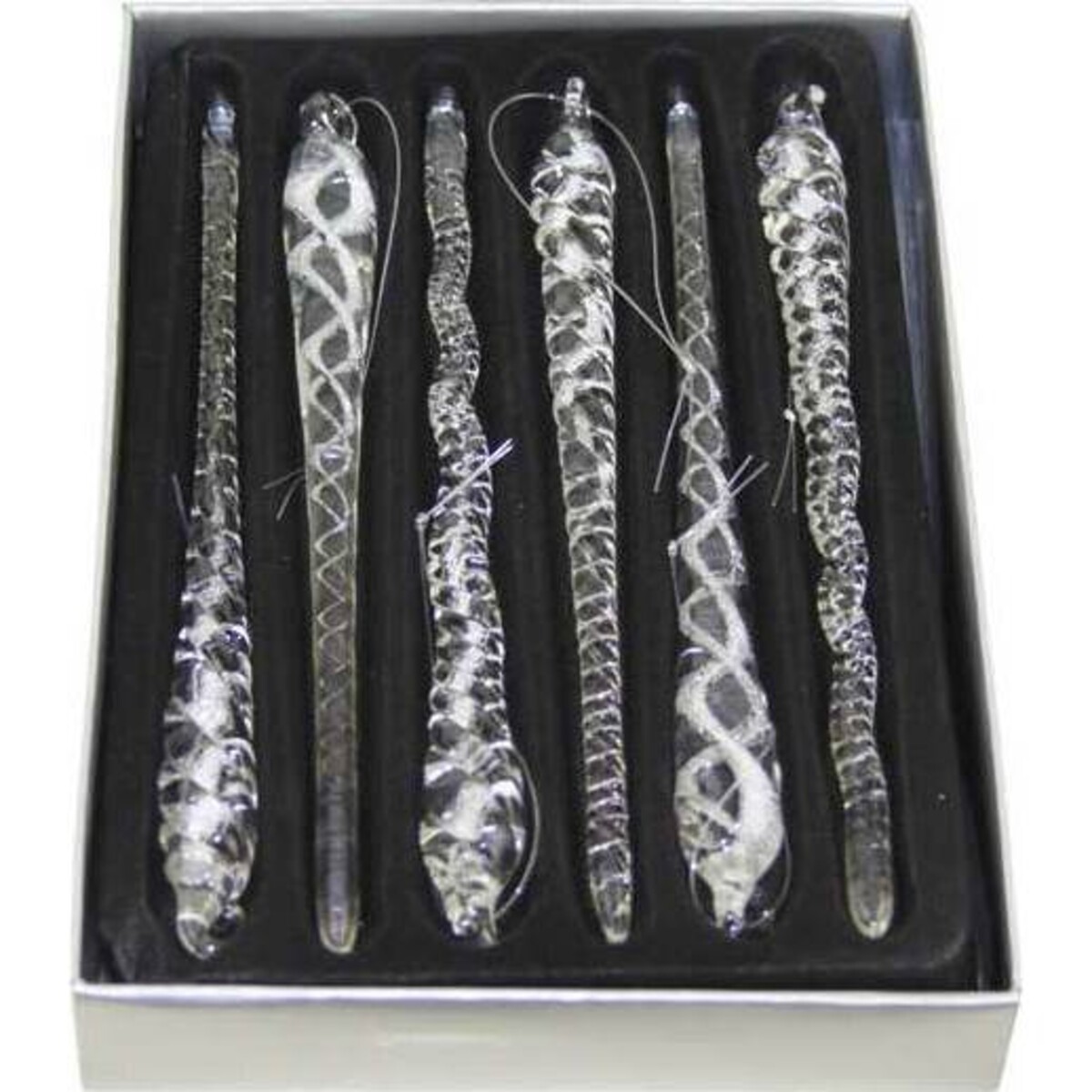 Glass Icicles Twist S/6 features 6 distinct, elongated pieces of glassware decorated in various ways that are used for decor purposes. Each of these items measures 1x1x15 cm. They can be bought by individuals for purposes of garnishing venues for different events especially those related to Christmas. As well, the artistic objects look like glass icicles depicting traditional artefacts, with some of them featuring intertwining spirals. They all have strands tied to one tip to enable hanging operations. This therefore makes them suitable for hanging onto a Christmas tree or upon the wall on decorative fabric.