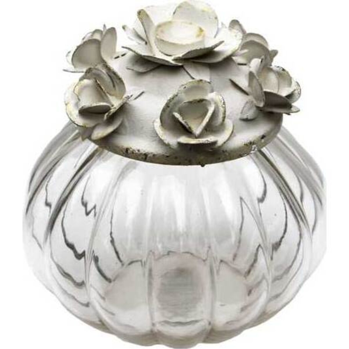 They feature a lovely array of white speckled roses that sit atop a creased round glass bottom. The roses have a slightly weathered look that only enhances their beauty. The glass bottoms offer enough detailing so the decorative pieces stand out while still allowing them to thoroughly display any goodies they hold inside. The decorative glassware is optimal for storing everything from baubles to candy. Although they're a lovely addition to any room, they're especially ideal for end tables, coffee tables, kitchen counters and dresser tops. A substantial amount of elegance is wrapped up in these little jars. They're perfect to use on a day-to-day basis or for special occasions. Considering their incredible beauty, they're optimal gift options for any nature or floral fan.