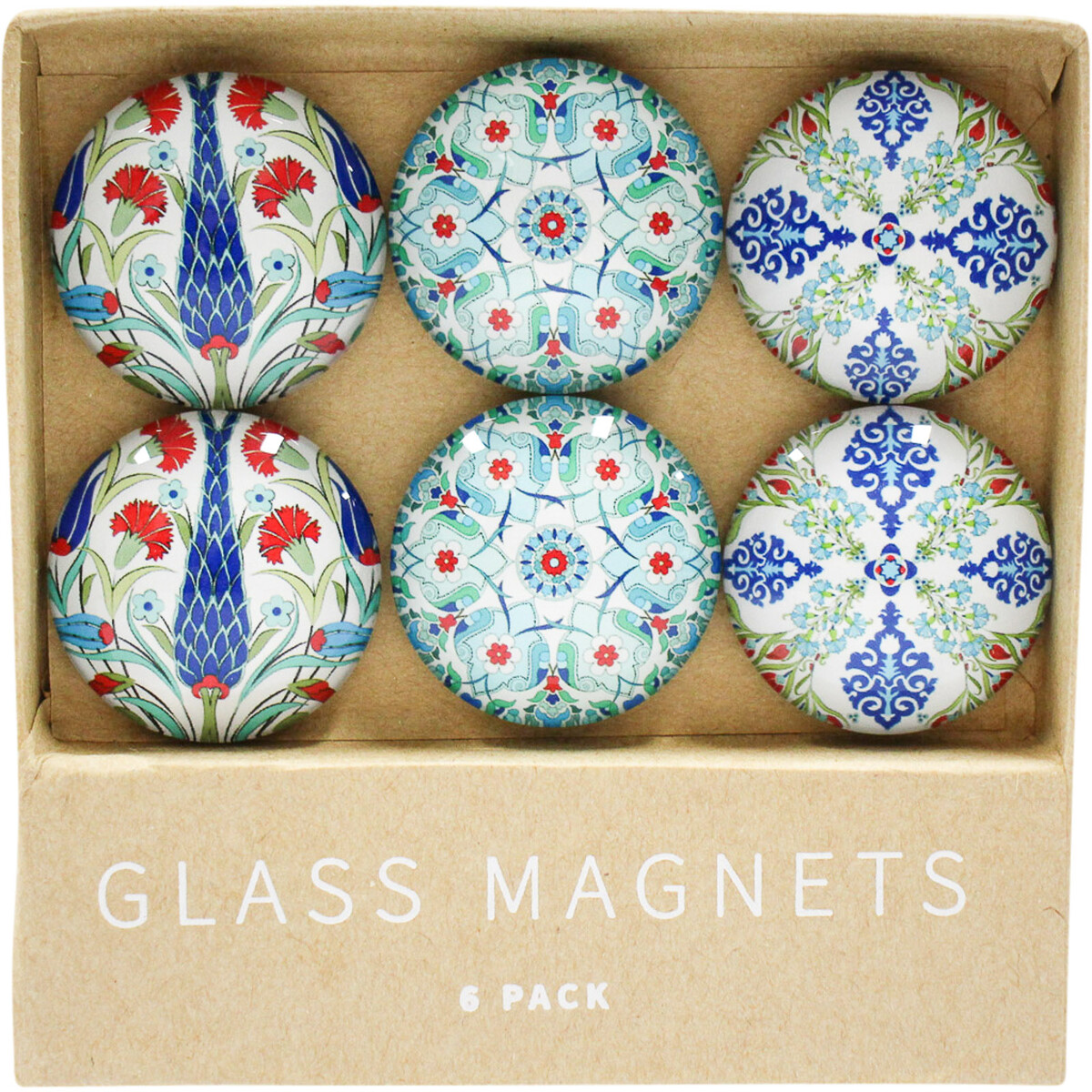All six magnets sold as a set that has been tagged Glass Magnet Turkish Delight S/6 all showcase a bright and alluring floral motif. All are made in the same spherical shaped design using the same material component but differ in terms of decorative finish. The first two glass magnets showcase a single stalk of brightly coloured flower having several bloomed branches. The two decorative magnets in the medial position also showcase a bright floral pattern. The third set of glass magnets also sport a chicly patterned floral painting with navy blue being one of its dominant colours.