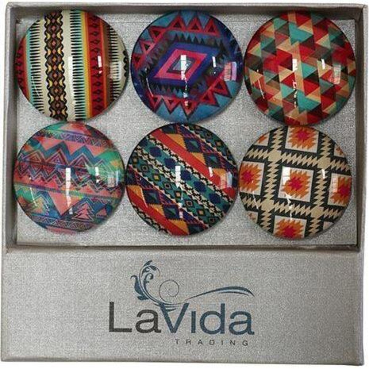 Here are some superior quality glass magnets that look amazing when placed in a larger number across surfaces of lockers, fridges, or any metal faces that could hold them as they are simply very tiny pieces of rat on high definition display. There are six bright modern almost Aztec in design prints that make this set are an eye - catching one for display. The size is about 3.5 cm in diameter and the superior quality glass as well the brightness of the printed materials used in the magnets makes them rather special. The magnets too are great quality that allows them to be used more effectively. Making your child's room almirah or the fridge in the dining room more attractive with these tiny baubles is so very easy. It does not take too much effort to make use of such pretty little accents. Gift them to a child and you would have won his or her heart for keeps. Each of these magnets has been carefully created with the right kind of glue and print within to make a gorgeous little impression wherever it is placed.