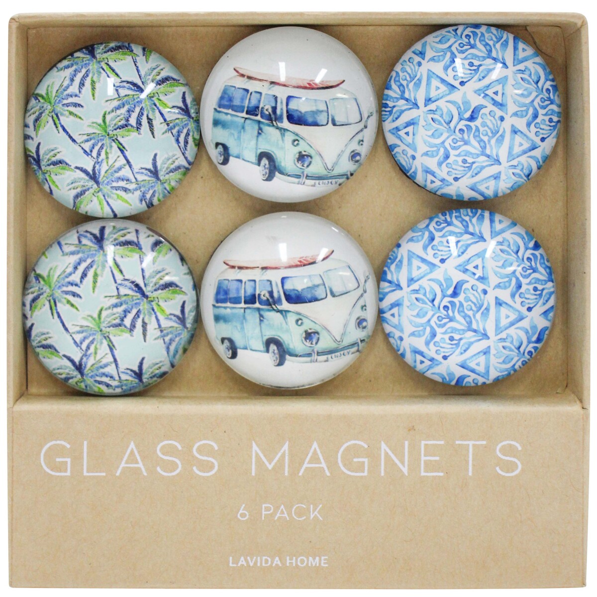 Our Glass Magnets S/6 Holiday Combi always get the team a bit excited - they’re just one of those products that retailers like us can tell have broad appeal. They’re perfect for a home office, kitchen fridge, or even a work cubicle. These are made from glass, and they come in a set of six. Each set features palm trees, boho blue prints and retro combi van designs.