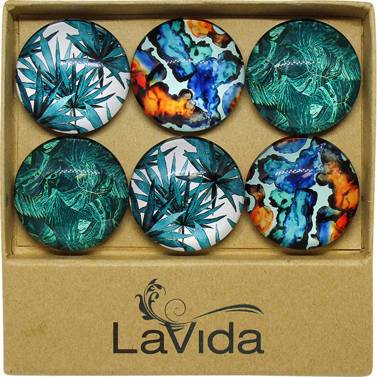 Comes in an interesting set of six such magnets, each tiny yet large enough to be seen from a distance and yet tiny enough to fit on to small little locker doors, on slim frames of windows, infusing in those spaces the colour and form they hold inside the small little glass made roundel. The beauty of the set also lies in its vibrant tropical feel. The great quality of glass ensures that the visibility of the pattern is great and the fine quality of magnet will ensure that it will hold on tight to the metal. The set has six pieces each of which has its own unique pattern and thus when placed in cluster will look fabulous. The magnets are solid in structure with the glass on top being clear and thick causing no image distortion. The abundance of blues and green in the graphics makes this a great choice for all who love the look of natural colours and wish to infuse the space with some natural revelry.