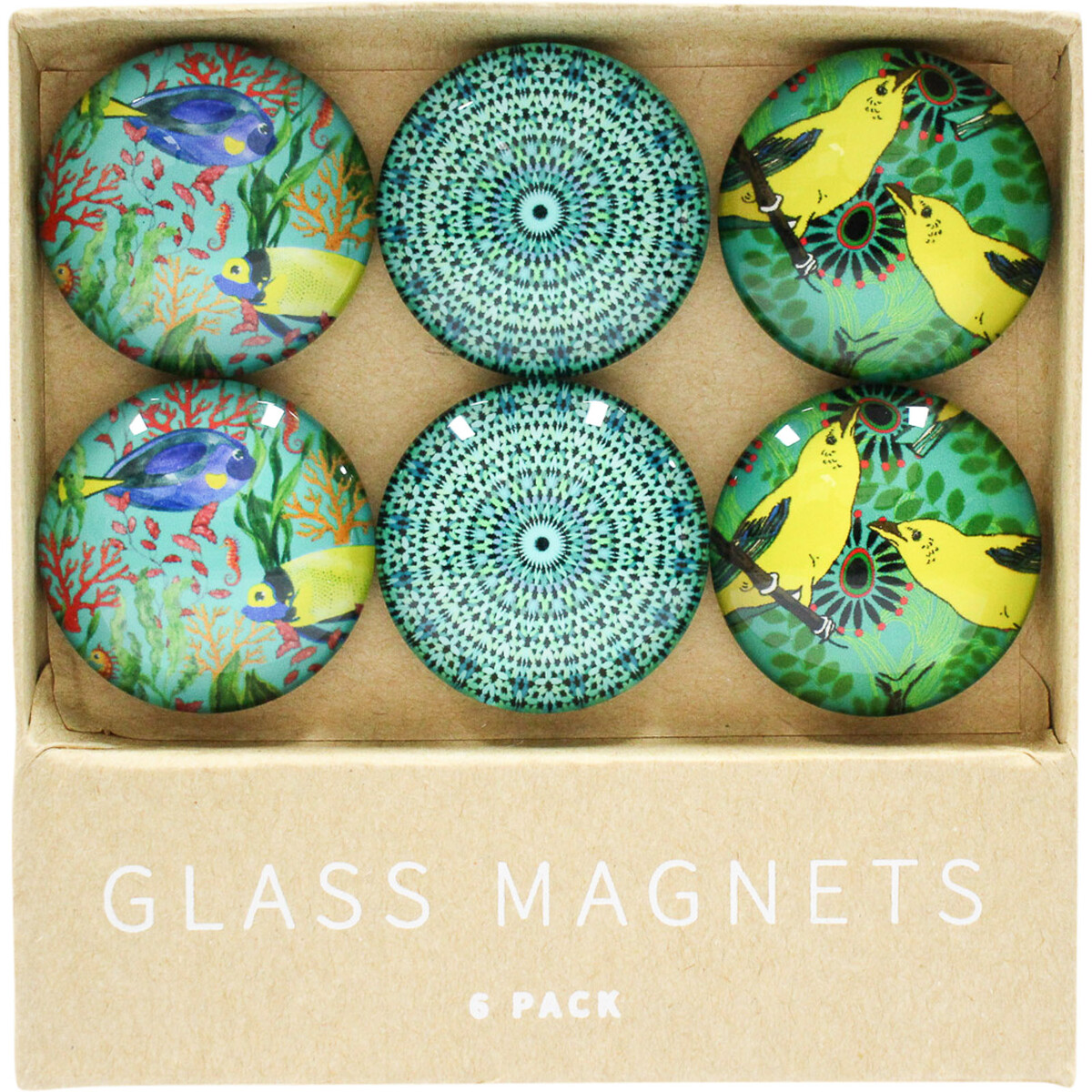 The first two magnets which make up this Glass Magnets Tropical Reef S/6 give a peek into the marine world of our country’s waters. Depicted are corals, sea horses, fishes and other oceanic creatures in bright colourful tones. The second pair of magnets is a circular maze of colours all of which form an expanding circle right from the centre. The third pair of coasters takes a peek at our forests with focus on two colourful birds having a plumage which is predominantly a bright shade of yellow.
