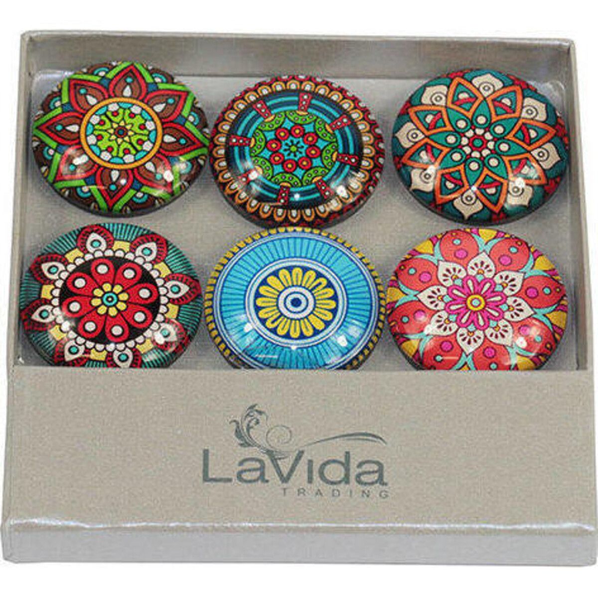 Add beauty to your smallest of spaces in the smallest of ways - after all not every space your use can be decorated with serious pieces of art! Here is a set of six gorgeously patterned glass made magnets whose clear image in the brightest of colours and the superb fit it gives you on metal surfaces due to the high - quality magnet fitted to it, makes it nothing less than a tiny art piece. Add it to the fridge door, the window sill, your locker door or the cupboard. Gift it away like any other party favour or simply add it to your collection of tiny baubles - after all life and art is all about variety and interpretations. Glass Magnets Tri Pattern set comes beautifully packaged so that all you need to do it place it in a smart little gifting bag and hand it over to someone who understands that colours and lively patterns in even the smallest version scan be just as great an embellishments as larger accents.