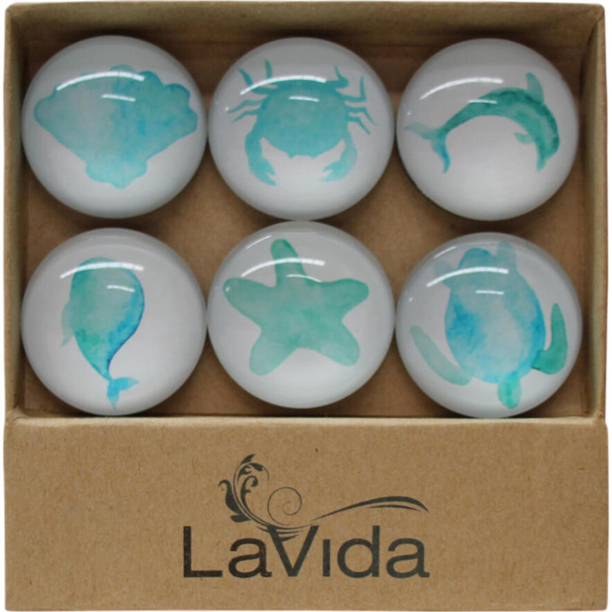 Though hand painted in the same ocean blue hue, each of these water creatures is different and you can enjoy these six distinct denizens of the ocean consisting of coral, crab, dolphin, whale, starfish and sea turtle. Each glass bauble is 3.7 cm in diameter and will make a little oceanic splash on your metallic surfaces, boards or fridge doors.