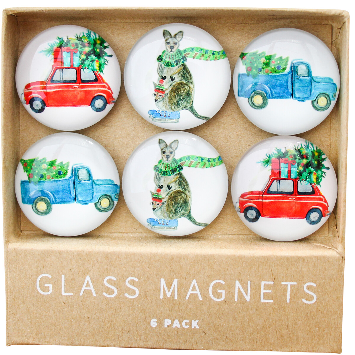 Our country is blessed with a lot of distinctive natural as well as man-made national identifiers. One of such natural heritage is the Kangaroo that is distinctively associated with our country. While an example of such man-made identifier is the Ute. It is therefore thoughtful that both of these national identifiers plus another making it a third that combine together to beautify this Glass Magnets Xmas Outback S/6. Both the kangaroo and the vehicles put on a Christmas motif. The vehicles are loaded with Christmas gift items while the two cute Kangaroo are also dressed in Christmas style.