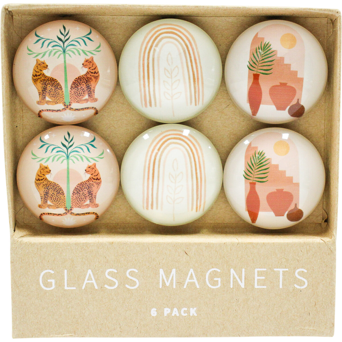 The six ornamental magnets which make up this Glass Magnets Ying and Yang S/6 can be categorised into three pairs. This is because while they are all made of premium quality glass material and are shaped in the form of a sphere, they are however, ornamented with a different motif. The first pair is decorated with the motif of two leopards sitting under a tree with their backs to each other. The second pair features a single plant with rainbow-like lines drawn over it. The third shows sunset, steps, vases and potted plant.