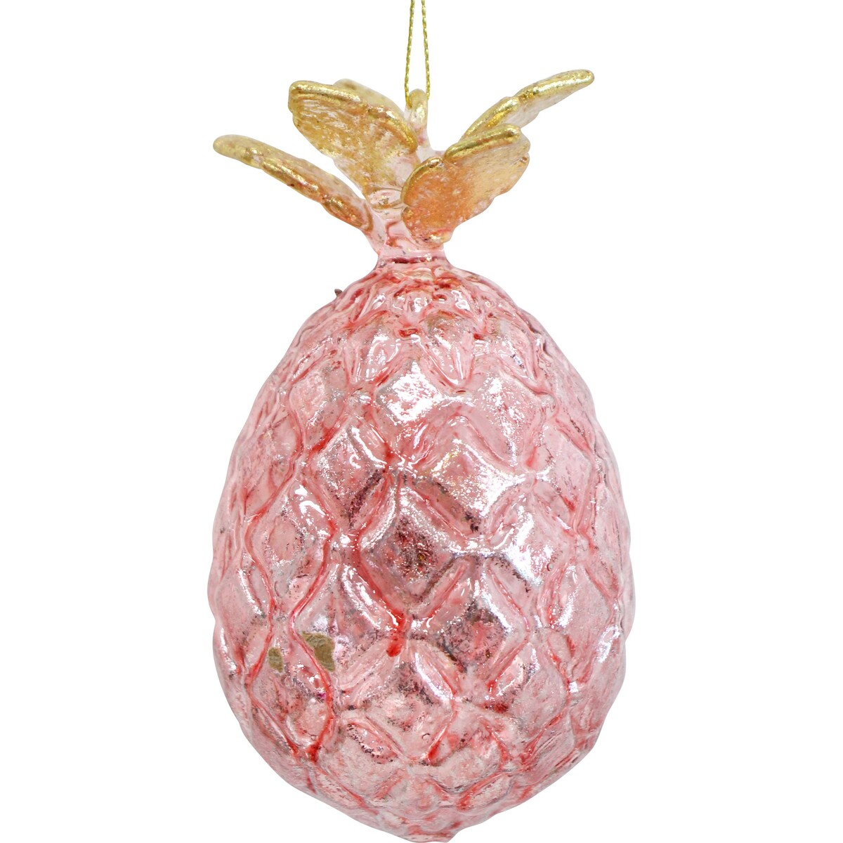 While choosing the look for your festive tree decorations, you could go the conventional way or could choose the more modern take on tropical look decorations and priming that look with the help of tree ornaments designed for impact, could be the way to go. Made from fine quality glass, this opaque pink hued glass made pine apple has a foliage top, designed with care and an eye for detail. The crown also has the attachment that holds the loop of string with which the ornament can be slung across tree branches. 11 cm in length, the slightly oblong shaped fruit ornate has gold coloured leaves that glow when the lights on the tree are switched on.