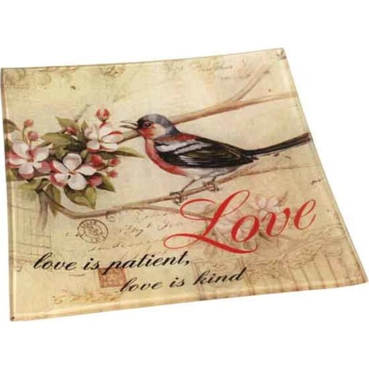 The Glass Plate - Love Bird features an inspiring message from the book of 1 Corinthians which reads: "Love is patient, love is kind". It also depicts a fine and artistic picture that depicts a bird and a bouquet of flowers.