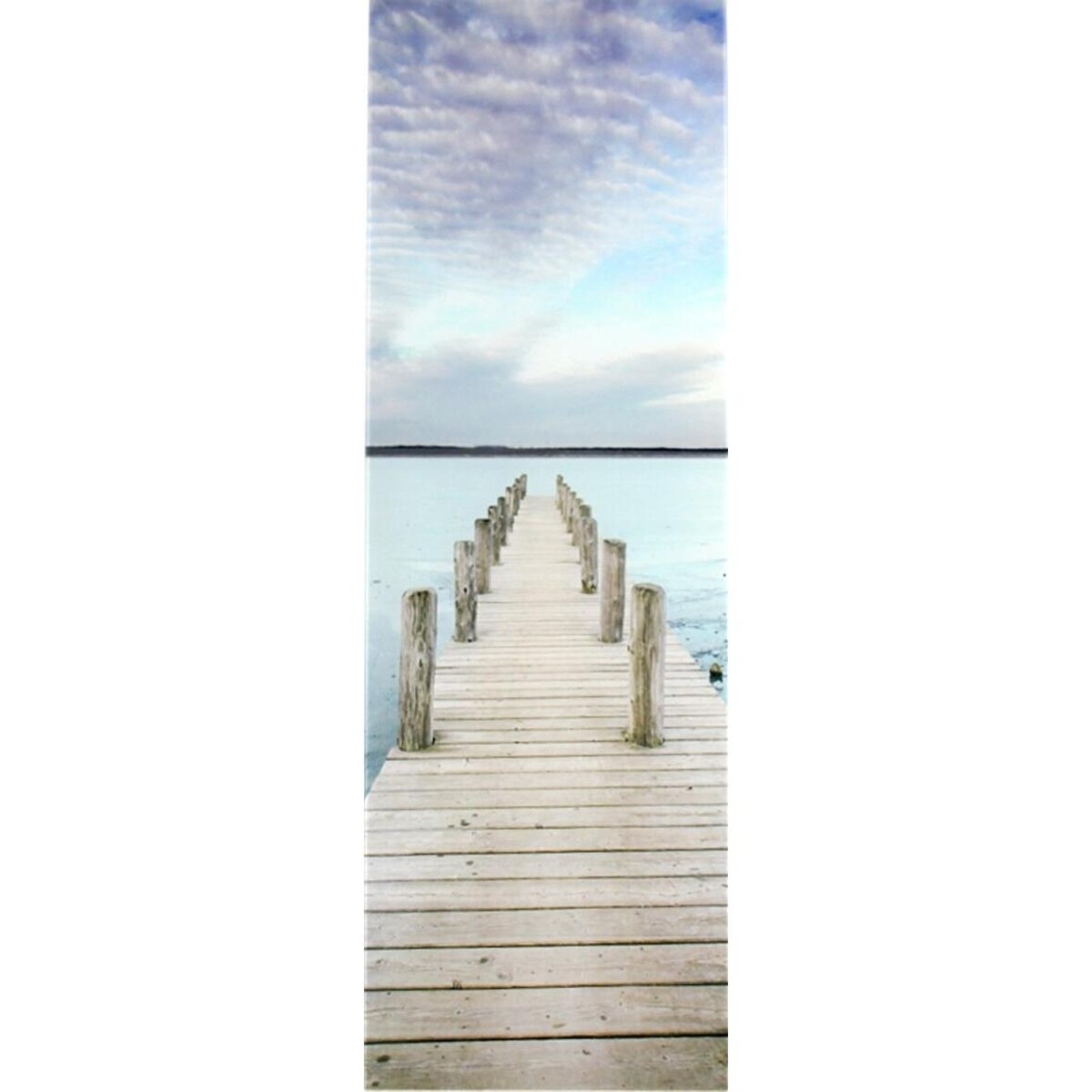 The print depicts a jetty -as if awaiting your arrival -to help you see the vast ocean beyond -maybe a passing ship or one coming there to anchor. You almost feel the urge to look down and see if a boat is tied there. The life like print has been made possible using the latest in technology where precision of form, colour and depth is what is making these new art prints on glass feel so alive and the best choice for homes. In fact the very reason why this art work impacts you is because of the feeling of actually appealing to your senses and the peace that come naturally to the depiction. A popular image that has found its way into many formats of art but this when seen on glass takes it to quite another level of beauty and vividness. The horizon at the distance-the speckled clouds and the colour of the water could not have even more natural. The length of the glass plaque is 40 cm while its height is 120 cm and thus its placement should be in accordance to the level of the eyes to heighten its drama.
