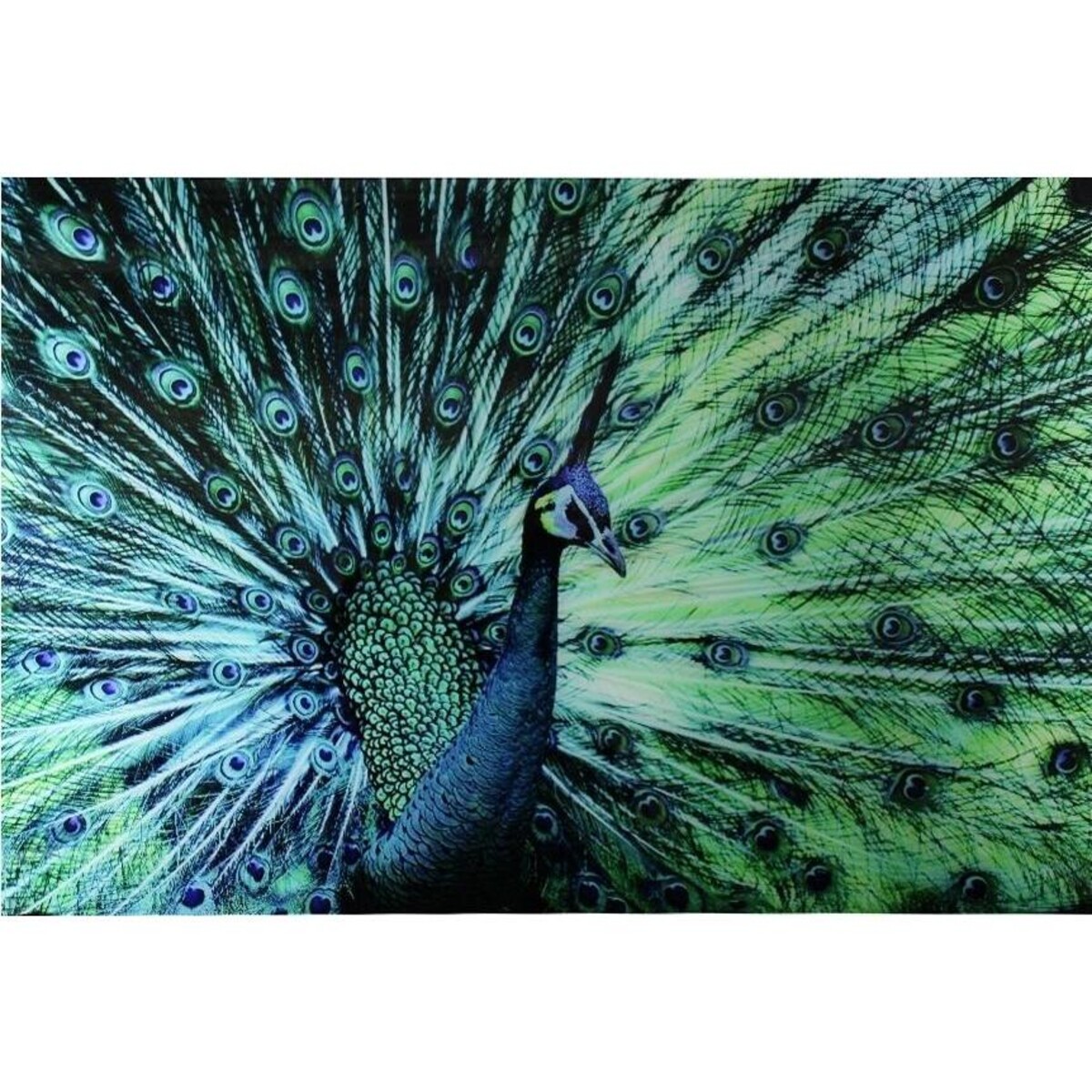 This board can capture the imagination of anyone in love with colours-reflecting the same vividness and myriad colours that this pheasant?s open plume is known to possess-this glass print does capture the essence of this colourful spectacle in the best possible way. The glass print in sharp, the resolution of colours deep and dense and the print altogether doing justice to the beauty of this bird. For all who wish to make their interiors rejoice with a colourful piece of art-this could be your best choice. Add it to build in a festive cheer-the kind that comes with bright colours and a love for nature. Add more such nature-based accents in the décor and let the creatures such as the peacock make you revel in the absolute beauty of their form. The print on glass has just the kind of size which makes it easy to display in any area of your choice-perhaps the gallery where a light could be placed focused on the print to help highlight the rainbow colours splashed across the glass. It would also look gorgeous on the wall above the sideboard or the interlude spaces where such art works wonderfully lending them colour and character. It is long enough at 120 cm wide and 80 cm wide making it quite a majestic presence.