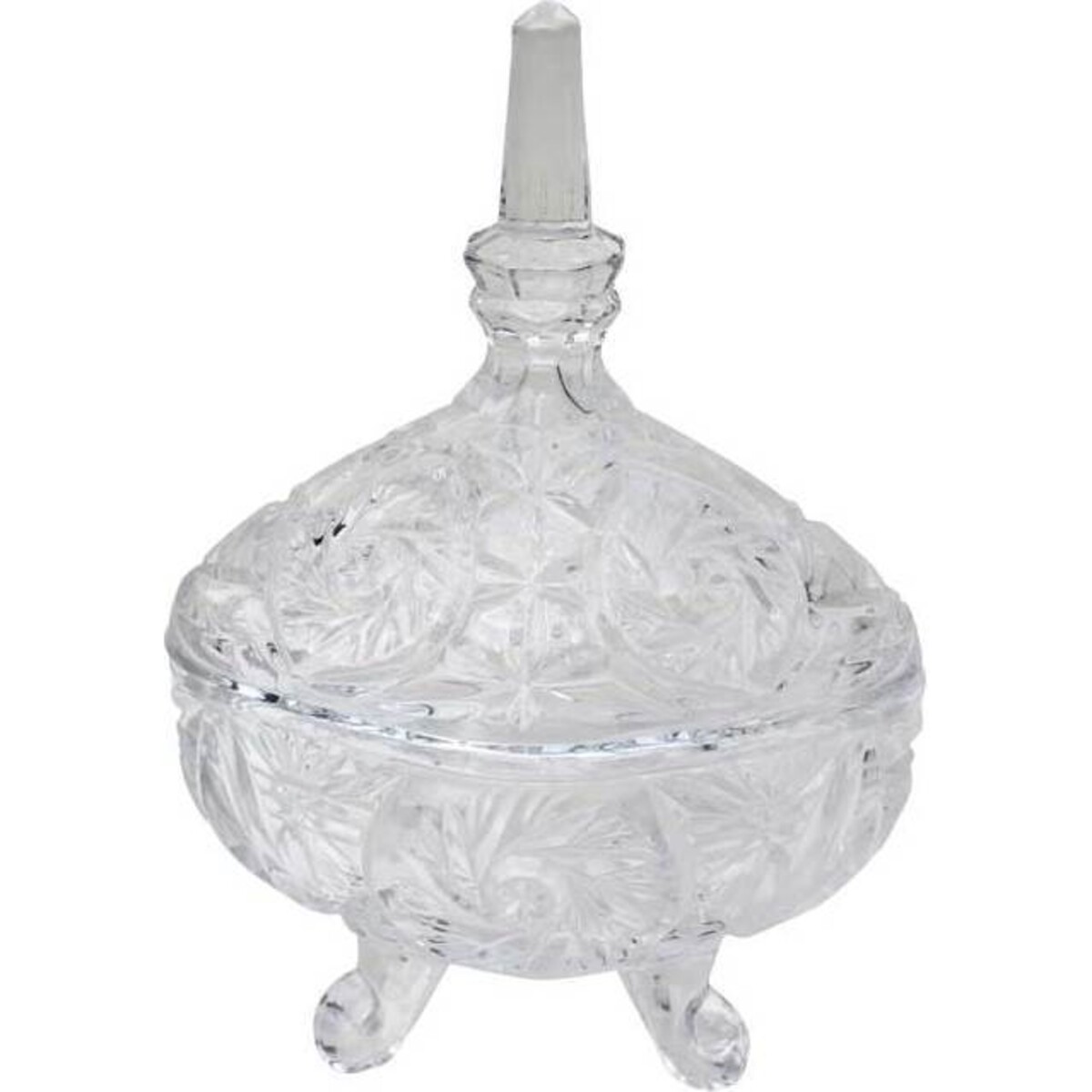 This isn't your ordinary trinket box. Two cut glass halves come together to form an oval shaped enclosure that has curved glass feet at the bottom and a spire at the top that serves for decorative purposes as much as it does for function as an easy-to-grab handle. When you're not storing trinkets in this box, it can also double as a wonderful little candy dish or it's even beautiful on its own. While it's a fabulous gift for yourself, it can also be a wonderful present for a loved one for any special occasion.