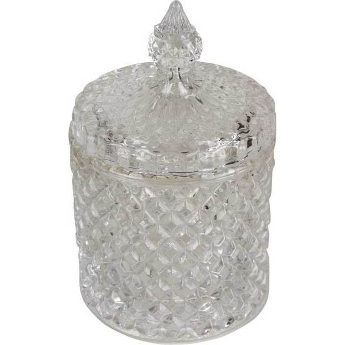Glass Trinket Box Cruz Small measures 10x10x10 cm and is composed of glass in total form. The glass bears characteristic decorations. It sports cylindrical shape with lid at its top that has a pointed tip at the centre to facilitate easy handling when opening the jar. This artistic glass product would look beautiful resting on a wooden table or stool as central piece. Buyers may use it for storage purposes within the kitchen or living room for instance or simply utilize it purely for decor objectives. Glass Trinket Box Cruz Small exhibits minimalistic dimensions and is graceful to hold and behold.