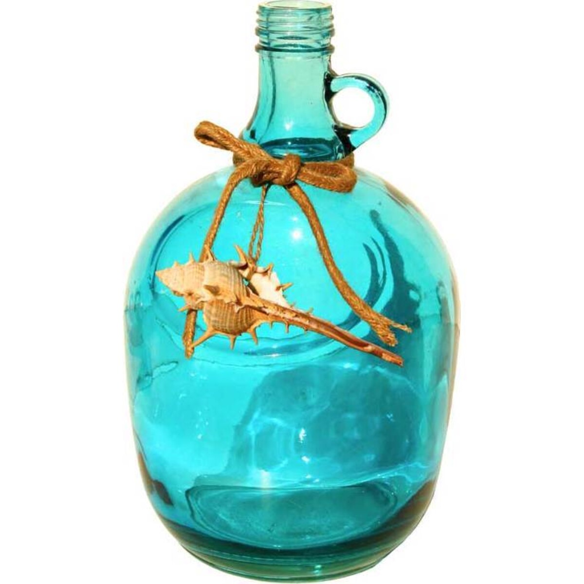 The Glass Urn Spindel Large helps capture the look and feel of the ocean with its deep, clear turquoise blue glass and natural seashell accent. This bottle features a traditional water jug shape down to its small glass ring handle at the top. A natural, weathered seashell is tied on with jute rope to accentuate the watery blue of the glass, making it the perfect home accent to complement coastal or beach decor. The glass bottle is the larger of two in a collection from LaVida and can be easily used alone or in pairs for more ocean - inspired impact.
