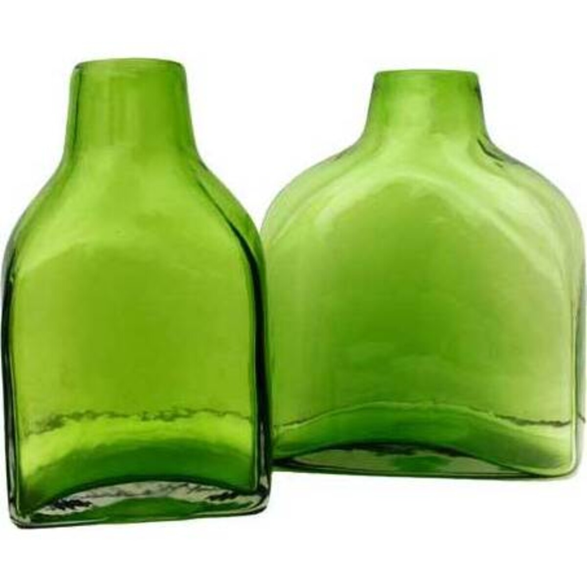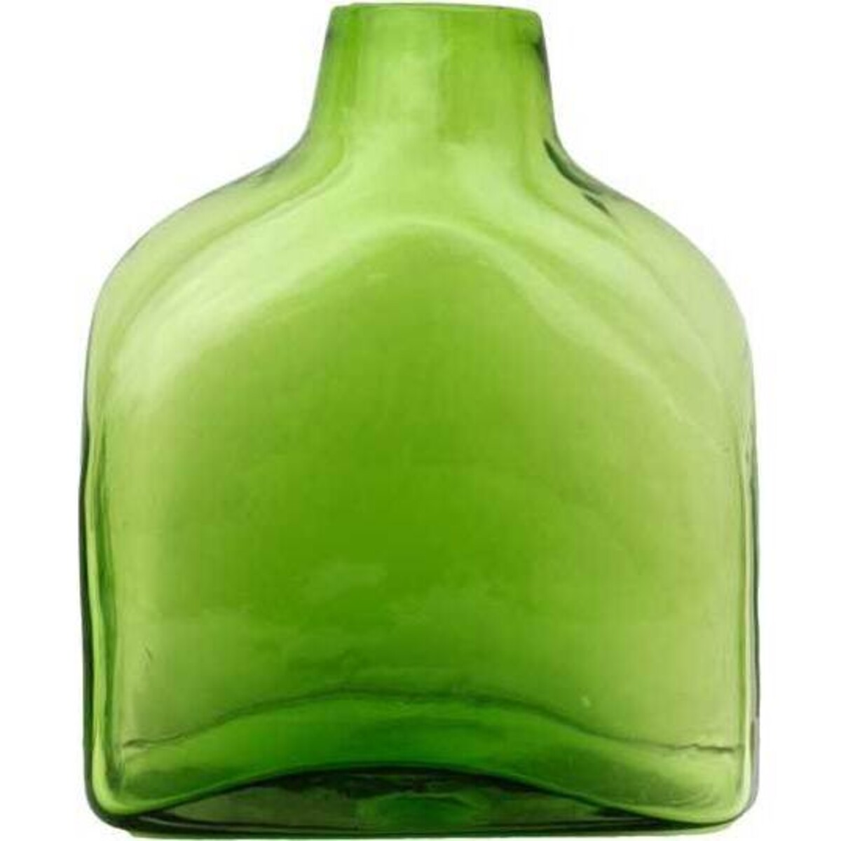 With the appearance of hand blown glass, the colour changes in density depending on how the bottle is viewed. A thick bottom curves up toward the interior, and the smooth rounded edges of this rectangularly shaped piece leads to a clean-cut narrow mouth. At 11 inches wide and 9 inches high, it makes a striking presentation in any decor.
