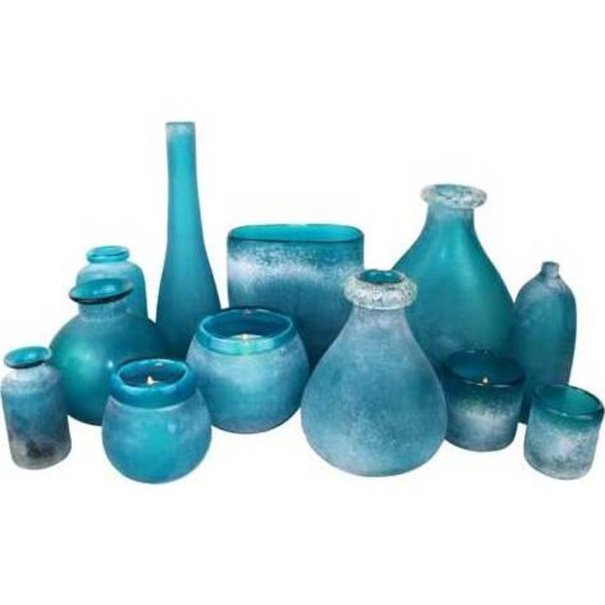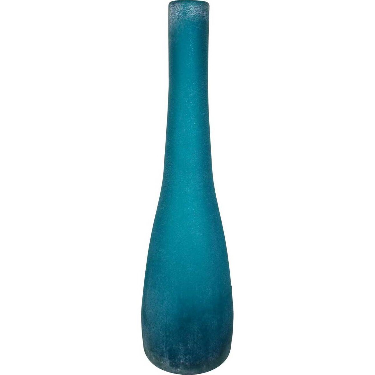 The Lavida range of glassware truly encapsulates modernity and experimentation with design and colour and this teal long stemmed glass vase is a glowing example of this style. The tall vase rises 35 cm and sits on a round base that is all of 10 cm in diameter, making it really a long necked vase that will be most suitable for holding single stalk blooms. A wonderful add on in spaces that want an elegant makeover. The glass is frosted and holds the stamp of exquisite finish that most Lavida glass items come with. Would look as pretty by the window catching the light or even by the bedside where one can wake up to the beauty of a single stem of a rose.