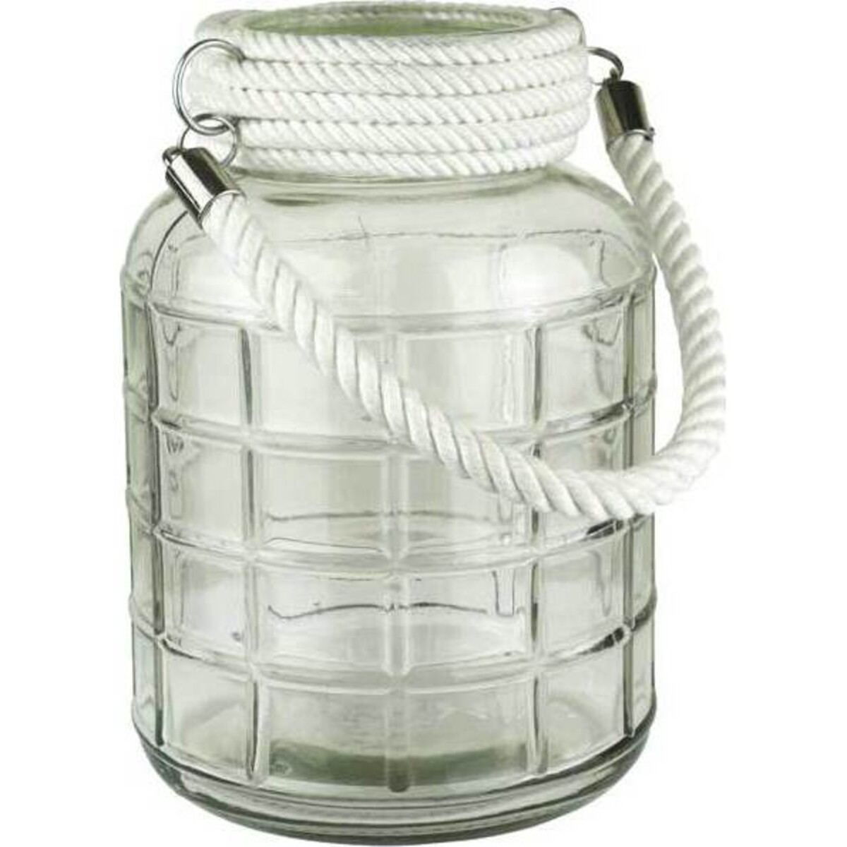 A neat combination of rope and glass makes this a unique blend of materials - the jar is all of 20 cm in height and has a thick white rope detailing at the mouth of the jar. The jar itself is made of sturdy clear glass that has linear ribs running across. The perfect way to use this would be not just as a candle holder for those parties that move outdoors but also to place and display some fresh cut flowers in the corner or to serve fresh lemonade on hot summer says. Easy to carry - it can be handled with ease because of its well designed rope handles. The look for the container makes it hard to miss and thus making it part of the centrepiece with a candle in it or hanging it somewhere with fairy light in it or simply using it to place flowers for display would be great ways to put it to use. Placed next to greens like ferns or houseplants it will add a different kind of charm and warmth to that space.