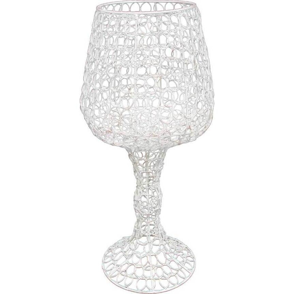 Decor items need to have their own distinctive stamp and go a long way in reflecting the personality of their owners. This goblet made from white gold metal is a fine piece of craftsmanship painstakingly created by expert hands that reflect the glorious tradition of metal smithy. The goblet is tall, about 49 cm in height and its base would be all of 21 cm while its glass portion balloons out to a curvature of not more than 21 cm which again allows it great balance on its neatly designed base. Its highlight of course is the manner in which the entire curly pattern has been created from wire and given this white gold polish. An eye catcher for sure, placed along with curios and antiques, this goblet will surely raise not just a toast to one's great taste but also to the very craft that it depicts, adding while it does all of this, great class and distinction to the decor. A great buy for personal possession or for gifting alike.