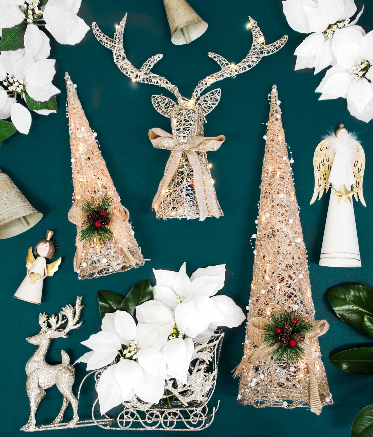 The Gold Reindeer Sleigh is made of metal and plastic material which is artfully crafted in such finely finished stylish elegance. The plastic metallic frame depicts the figurine of one of Santa's 9 Reindeers standing proudly with his impressively crafted antlers tilting back in a proud pose. Behind him is the ornately crafted and decorated Santa sleigh. Both the Reindeer and the sleigh are hued in a bespangled champagne gold colour. Wholly covered in glitters, this novel piece glows with glittering brilliance. It would make a perfect gift item for friends, family, colleagues and loved ones in general.