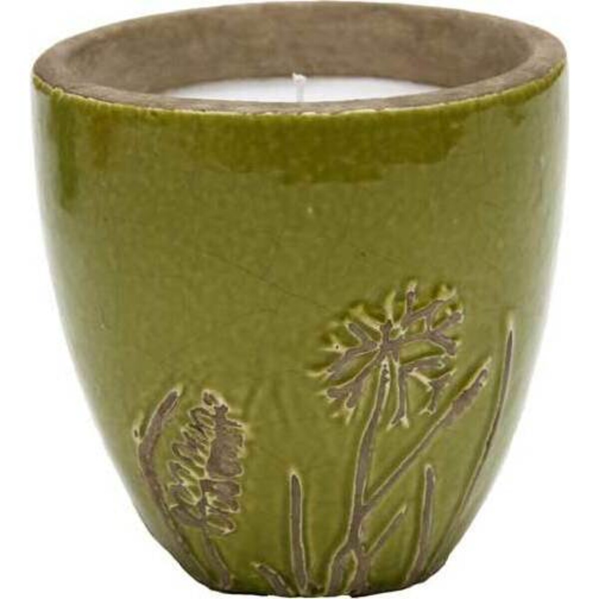 Introducing the Green Flower Candlepot from Lavida. This fabulous decorative accent is stone-coloured on the inside with a white candle, and the outside is olive green with a fabulous flower and stem detailing. Don't let its small size fool you, this item packs a big dose of colour and style into a little space. Whether you use it or just display it, you'll love having this candle in your home.