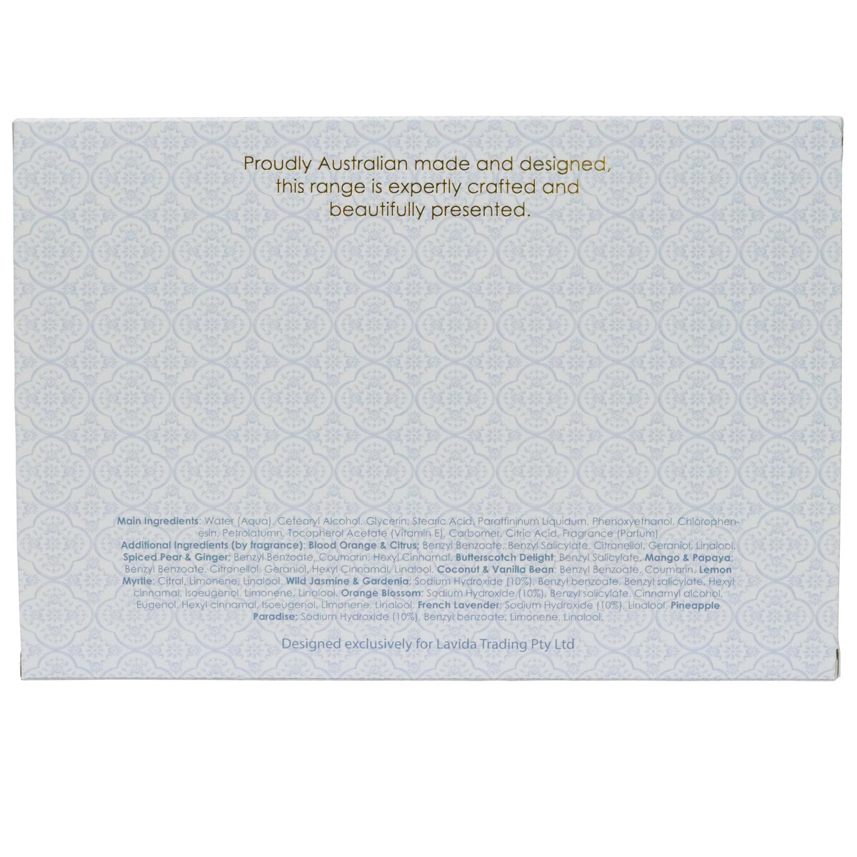 We all need a bit of self-care these days, and this is just the right gift for the hands. Our Hand Cream Gift Set Classic comes in a stunning, luxury gift box that’s a treat in itself. We’re quite proud of how beautifully presented it is, honestly. It comes with three 100ml hand creams in Wild Jasmine & Gardenia, French Lavender, and Spiced Pear & Ginger. Each of these has its own distinct scent that creates a wonderfully aromatic experience when applied to the skin. The hand creams are Australian made and designed, expertly crafted using only premium ingredients. These include vitamin E for intense moisturising, as well as shea butter, argan oil, jojoba oil, and sweet almond oil - all chosen for their antioxidant-rich properties. This product is designed exclusively by us at Lavida Trading Pty Ltd, so you won’t find it anywhere else. Give your customers a rich hand care experience with our Hand Cream Gift Set Classic.