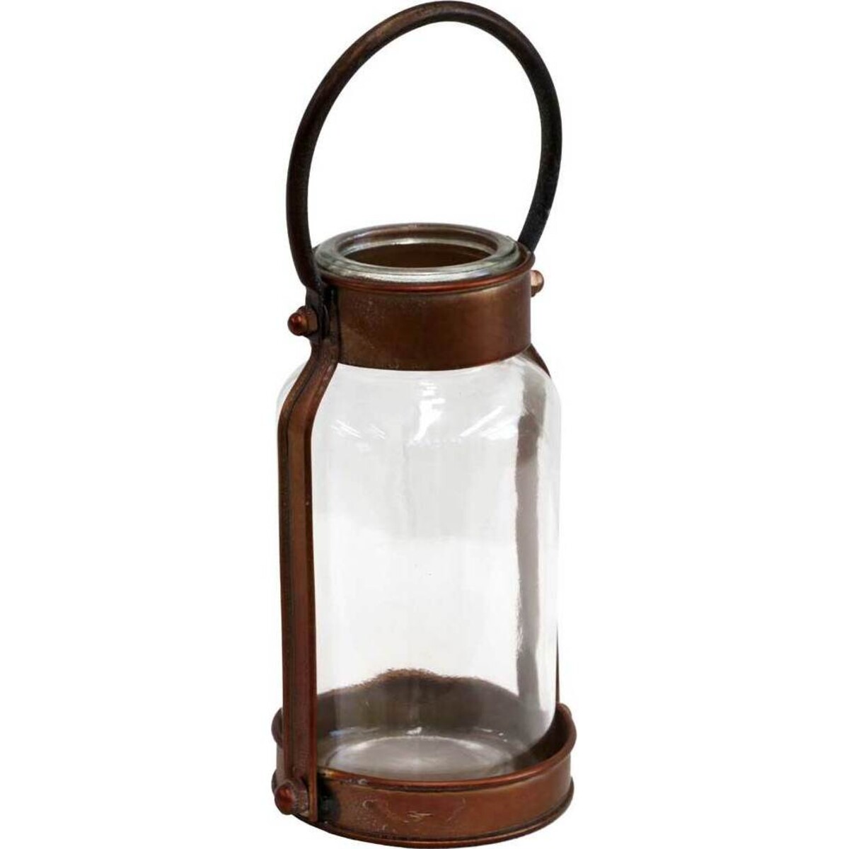 The clear glass bottle stands at a height of about 16 cm and has a metal rim and frame that clasps it from two sides while running right down to its base. The handles too arise out of the same structured frame and is the same deep copper colour which strikes one to be such a contrast with the clear glass bottle. The handles of course will allow easy portability and it would consider this such a versatile piece that it is difficult to say where it could be sued - could be a vase when needed, a pitcher to serve infused cool drinks in summer, maybe juts to hang somewhere with a pillar light inside it or simply holding roughly bunched up fairy lights. The possibilities are numerous. It rather country and farm sort of look will sit organically with all homes that host a fresh country feature. The hanging facility as well as the usage of high class material will make this an adorable addition to the home.