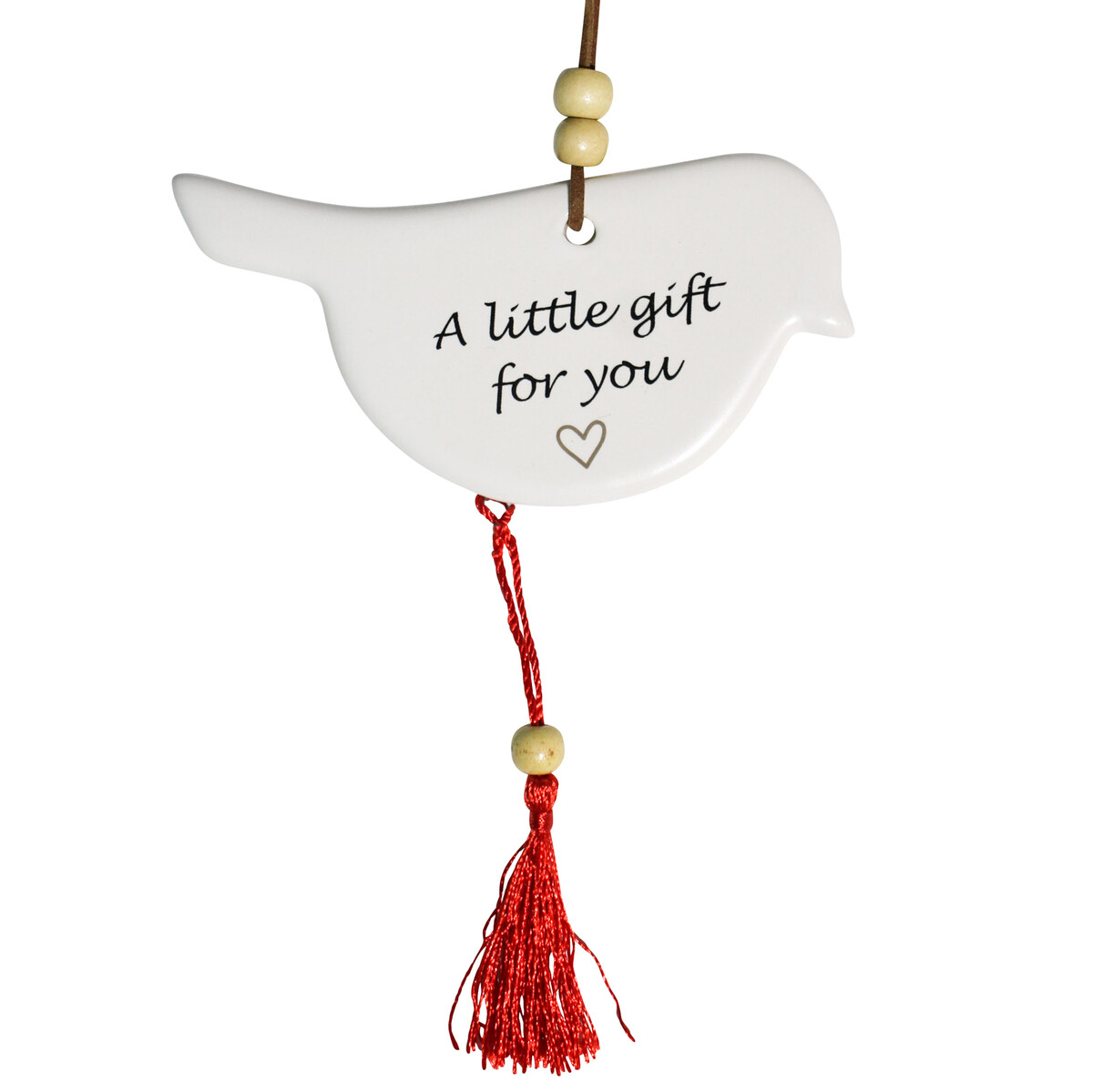 The overall design is quite pretty - a white bird-shaped ceramic hanging ornament that measures 12x8cm (that’s without the hanger and red tassel).