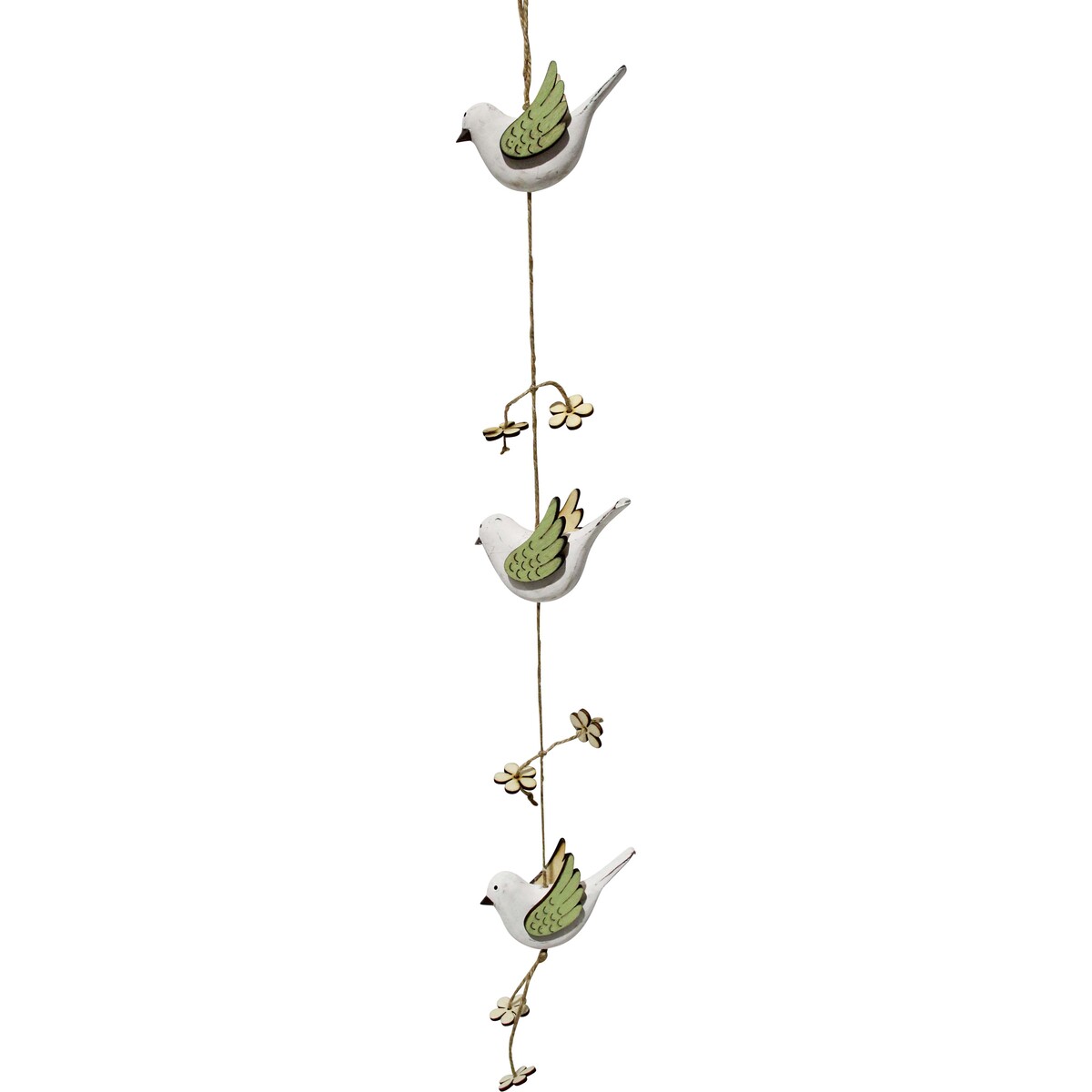 They fall in a trail -a row of birds that seem to be harbingers of the changing season. A great way to make your windows acquire an interesting look. They will fall down the side of curtains, creating a gorgeous little frame. You could have two of them on the sides of the curtains at the window where the breeze can make them twirl and add more charm to their presence. Crafted by hand with wood and MDF, the three birds are detailed in design, white and green in colour with flowers interspersed between them. Makes a playful and fun looking display in your spaces that could be used in several spaces in many differ ways. The 65 cm long trail is a helpful addition when you wish to draw in every part of your home into the joyful theme of springtime.