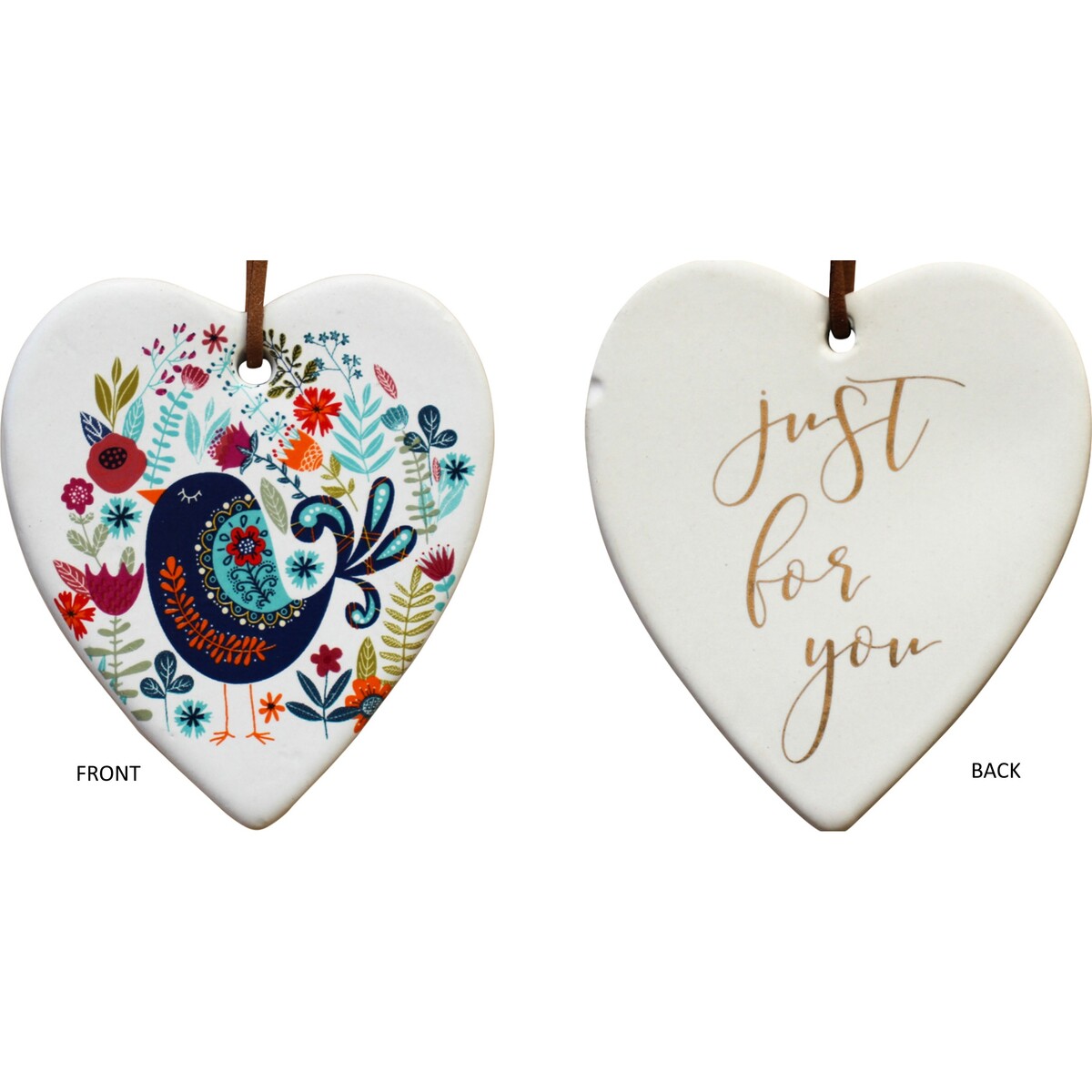 After all, when things come straight from the hart and on a heart, it can rarely miss the mark a gift for someone you care dearly can best be said on a heart. Here is one that has-been beautifully created by hand and given this hangable option with the help of a ribbon that is lotted though the top of this heart. The print of a bird on one of the two sides gives it a gorgeous rich and ornate kind of look , filled with colours and a certain kind of cheeriness to it. the other face carries the message in three clearly printed words-just For You. The fine printing technique, the neatly finished edges and the rather smooth and sparkling white of the ceramic only suggest that the best in this craft have bene engaged in creating this piece. Could be used like any other tag-maybe on large gifts or simply be used to deck up a small little space with warm wishes that go straight to the heart.